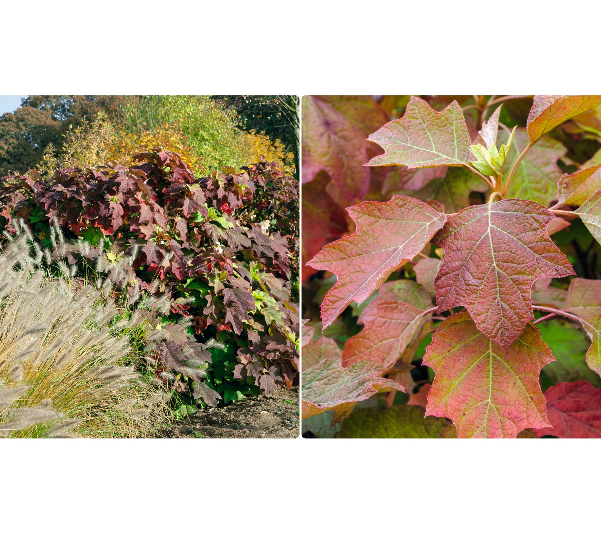 Ruby Slippers not only produces elegant, oak-leaf shaped, lobed foliage that changes color in autumn, they also produce huge cone-shaped flowers that start as a creamy white and age to a ruby red over the summer. This compact cultivar never gets unruly, and is the perfect shrub for sunny or part-shade gardens. From Roberta's.
