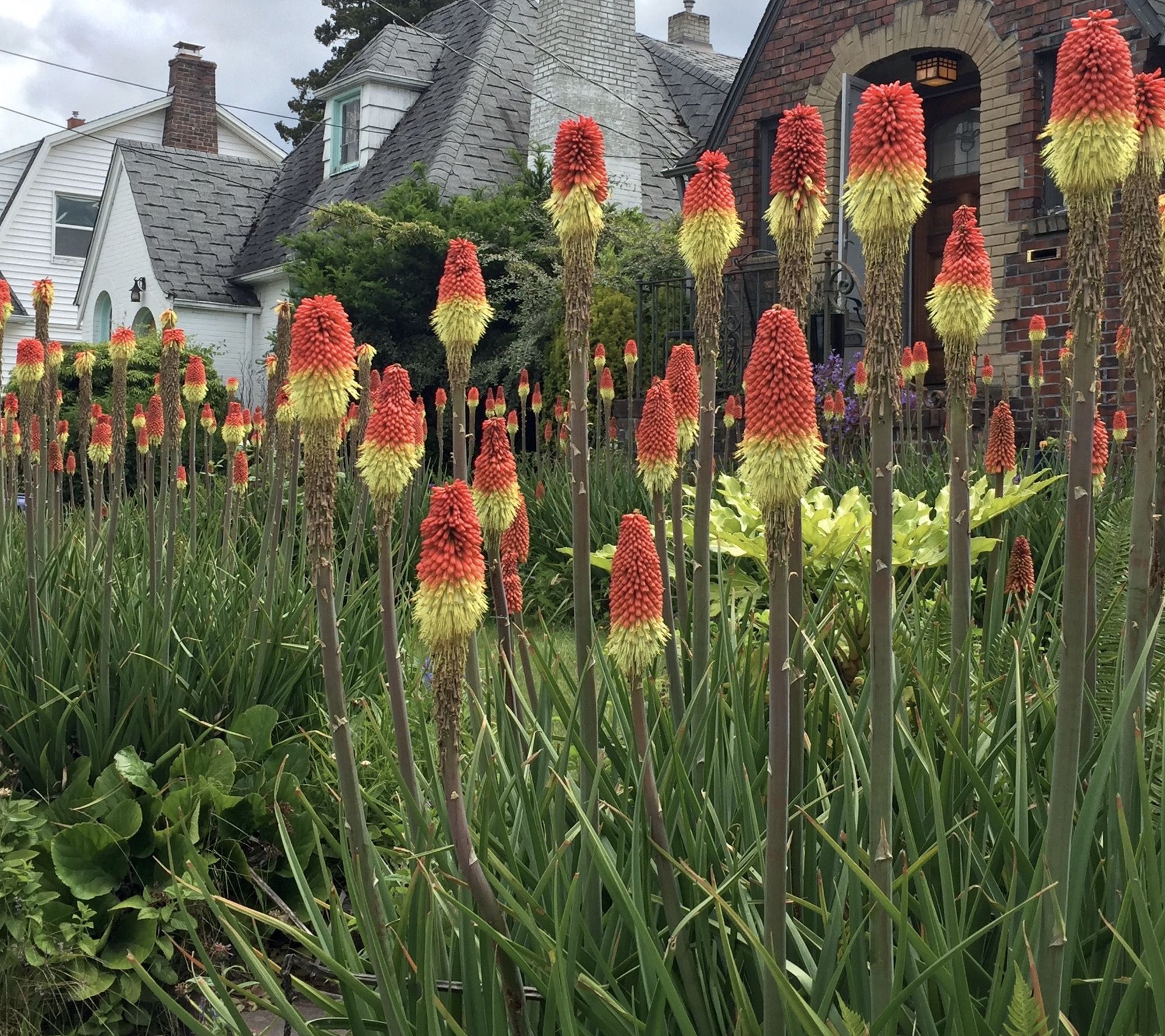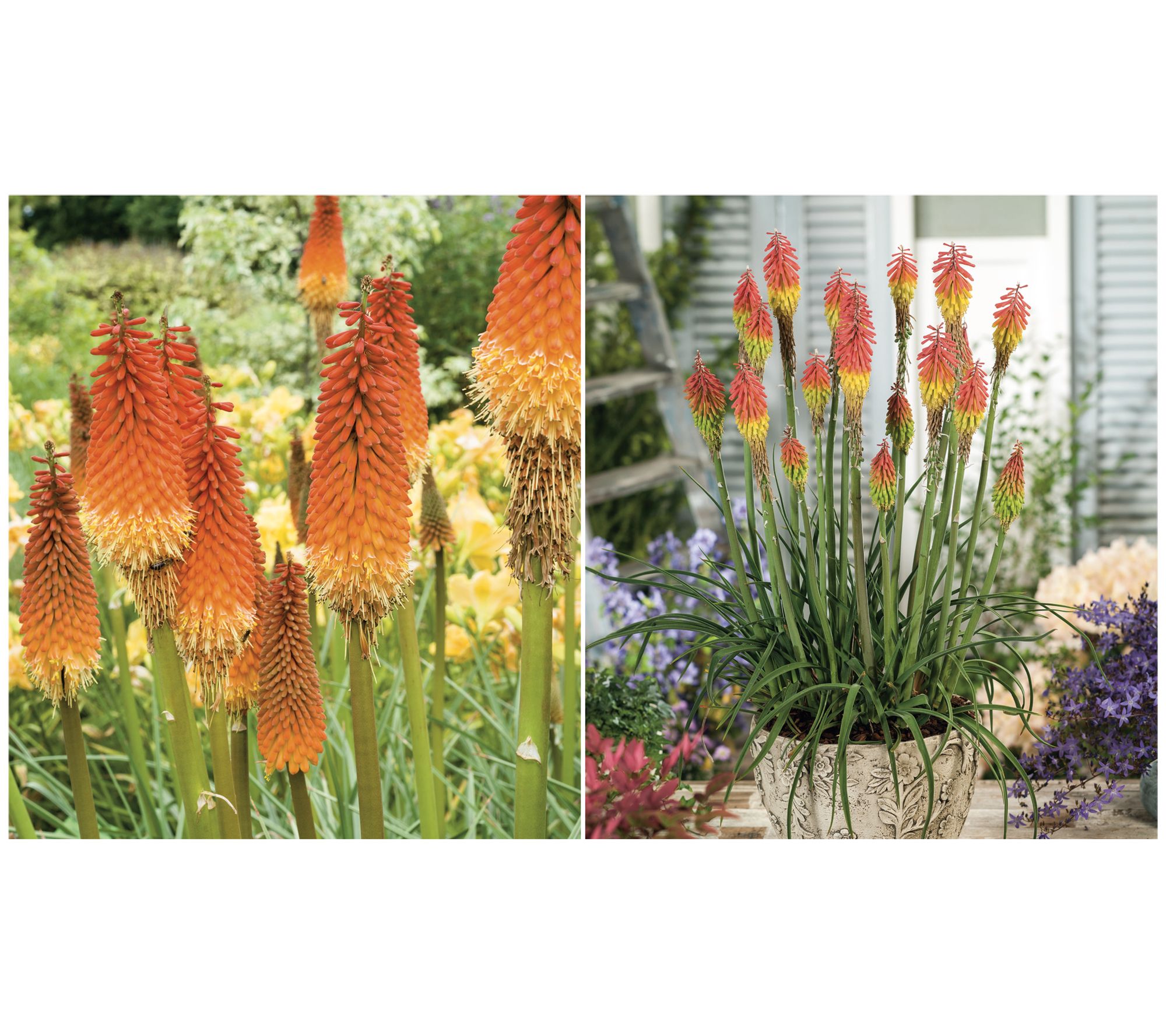 Bring vivid color to your garden with Roberta's fiery red hot poker flowers. These dramatic plants feature stunning flower spikes that transition from red at the top to orange and yellow further down, resembling flames. Perfect for the hottest parts of summer, they attract hummingbirds and are easy to maintain and are ideal for any area where you might plant daylilies. From Roberta's.