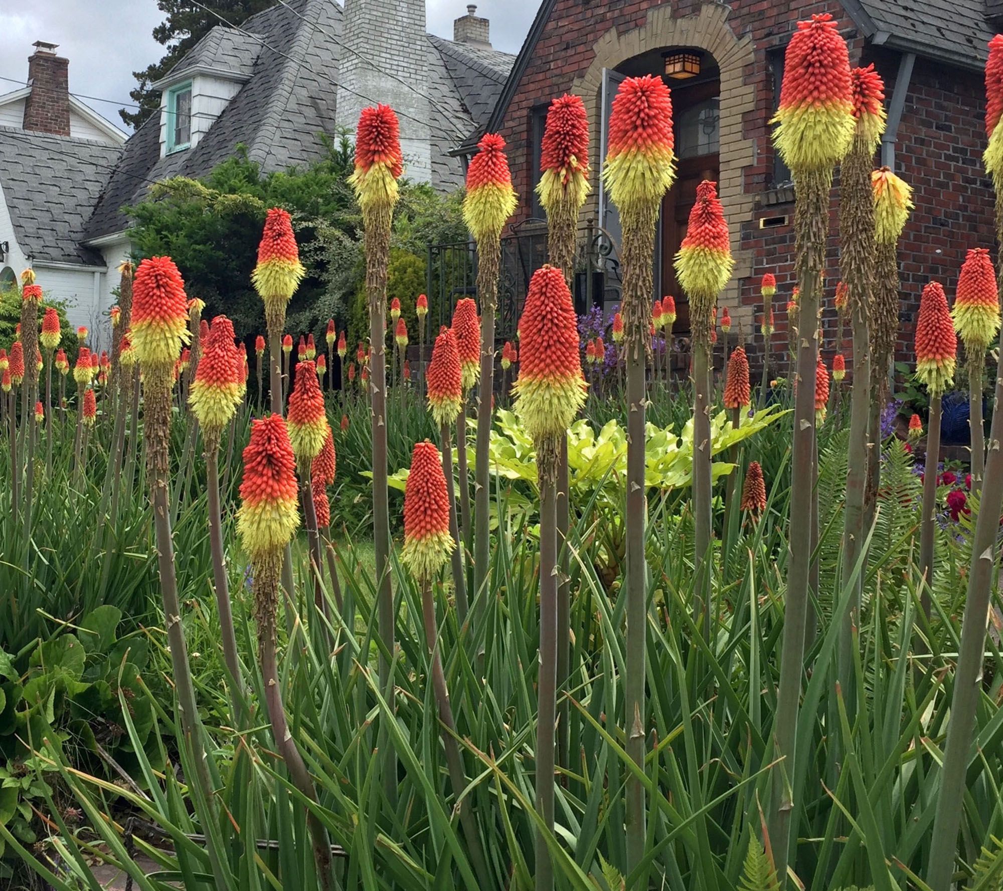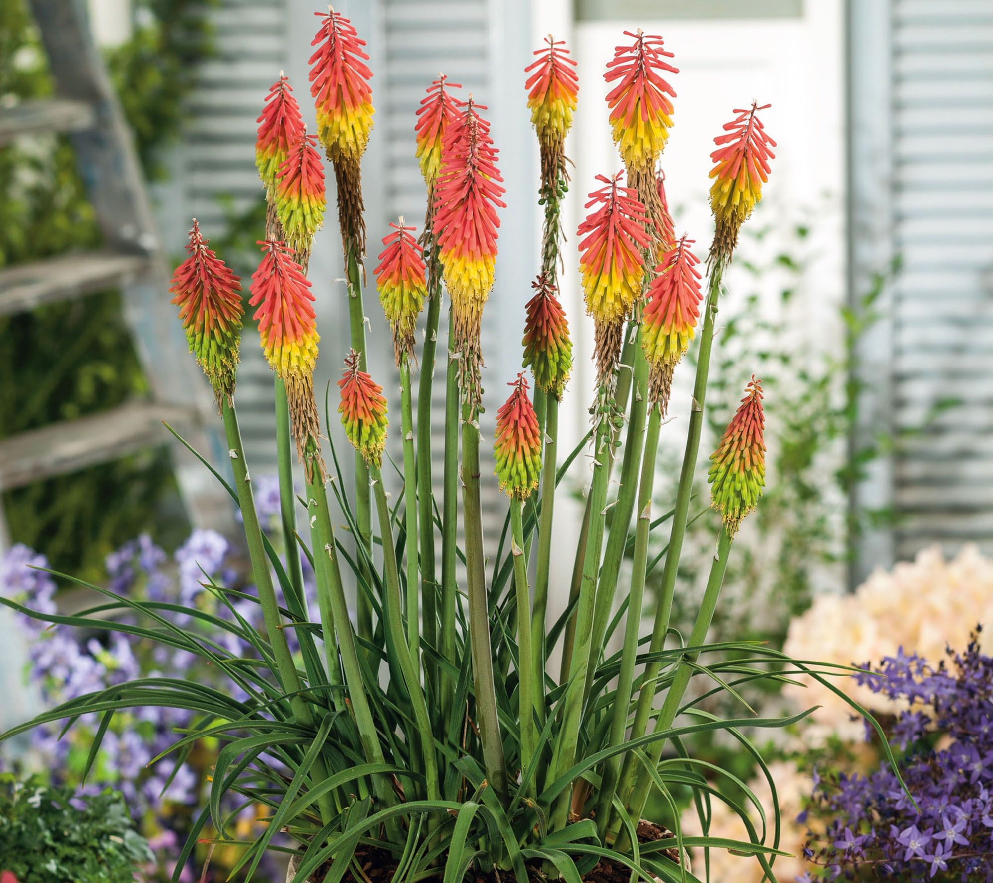 Summer garden displays shine when Fiery Red Hot Poker flowers send up tall spikes bursting with flame-like blooms in vivid red, orange, and yellow hues. These perennial plants offer abundant color with minimal care, thriving through heat and dry spells while attracting hummingbirds to their dazzling flowers and resisting deer and rabbits. Add to garden beds, borders, or sunny spots for a stunning, reliable show year after year. From Roberta's.