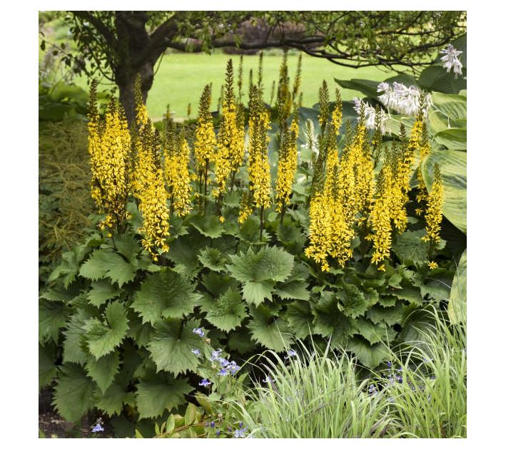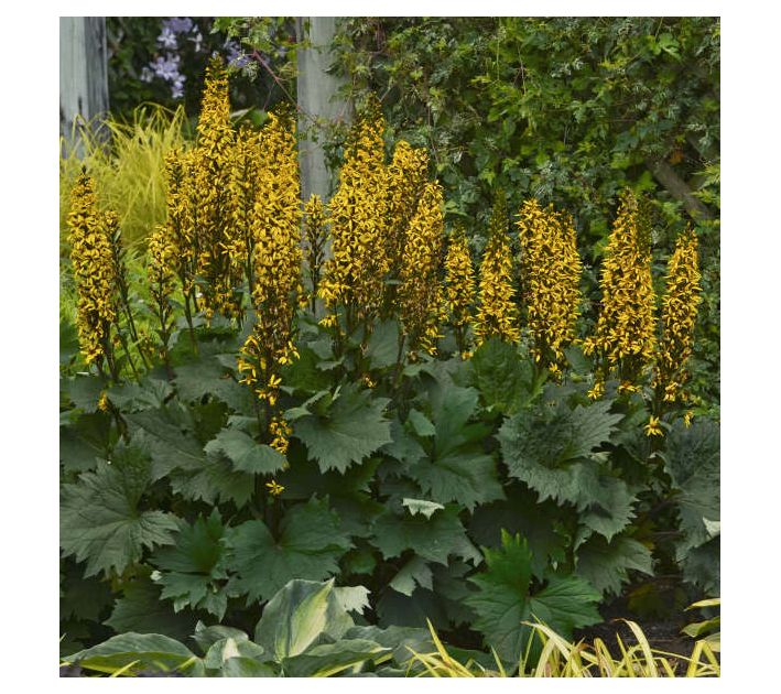 Add an eye-catching touch to your garden with Roberta's Ligularia Leopard Plant Bottle Rocket. This perennial thrives in cool, moist areas with partial shade, blooming vibrant yellow flowers in the summer. From Roberta's.