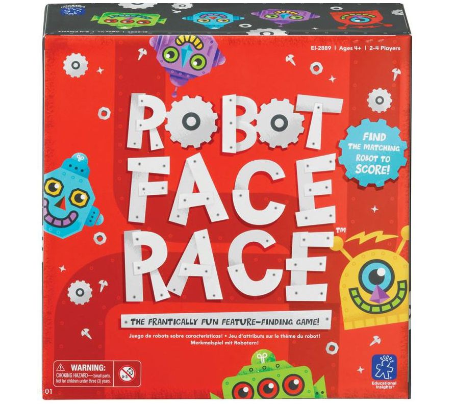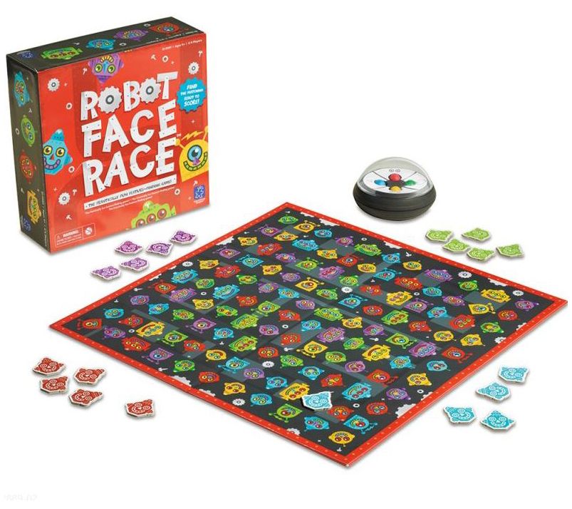 Race to find a robot match on the Robot Face Race board! Shake the robot randomizer and scan the board for a match. Find it first, and win a token. Collect five tokens, and you win Robot Face Race, the fun-for-the-whole-family game. From Educational Insights.