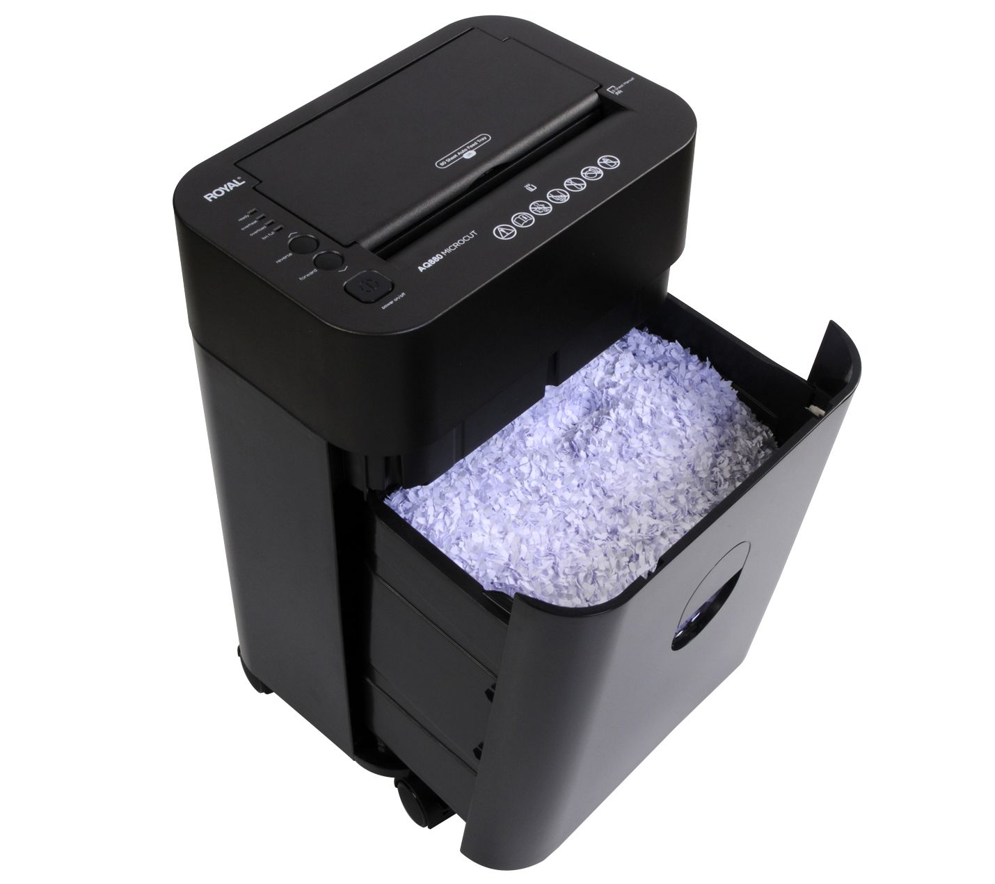 An efficient way to dispose of personal paperwork, the AQ880 micro-cut shredder not only shreds up to eights sheets at a time, but also has an auto-feed function that allows you to load up to 80 sheets. From Royal.