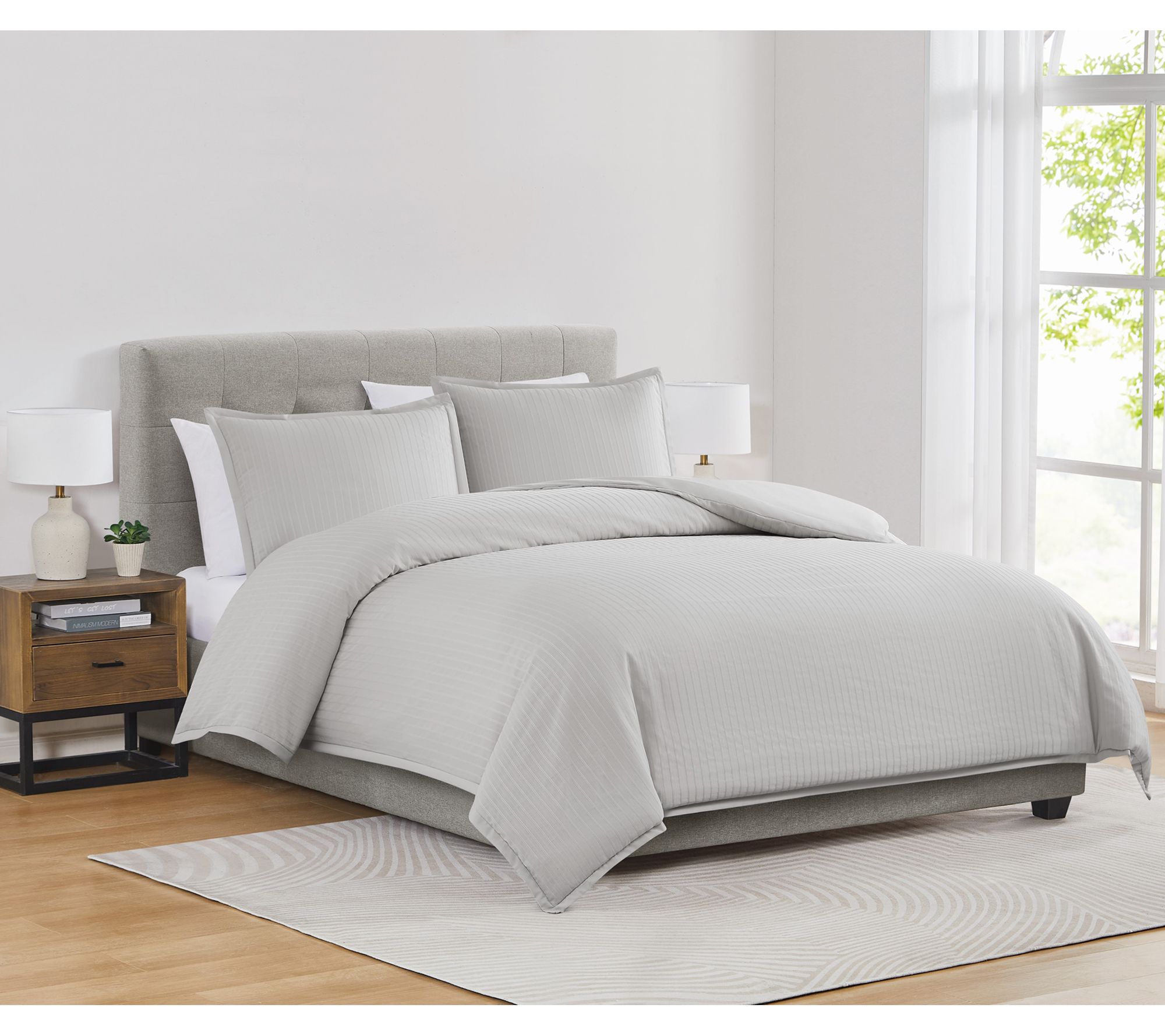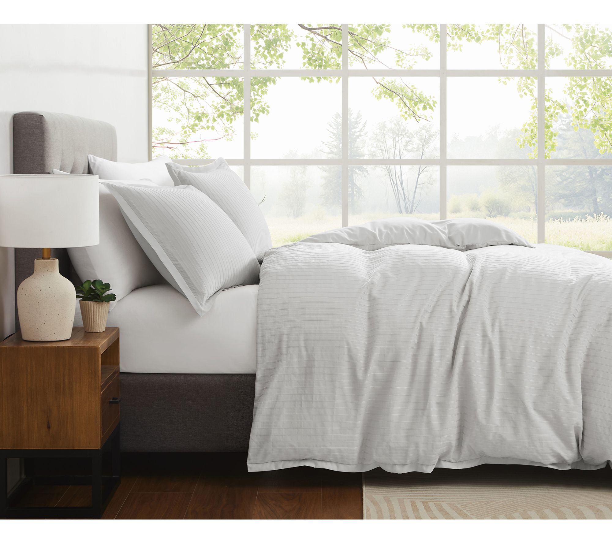 Transform your space into a relaxing haven with the Royal Velvet Olivia Stripe King Duvet Set, where cozy comfort and refined style meet. This bedding set offers a textured woven stripe design paired with a soft solid reverse, making it easy to switch up your look to suit your mood. The lightweight fabric is ideal for layering, letting you enjoy year-round comfort and effortless bedroom updates. From Royal Velvet.