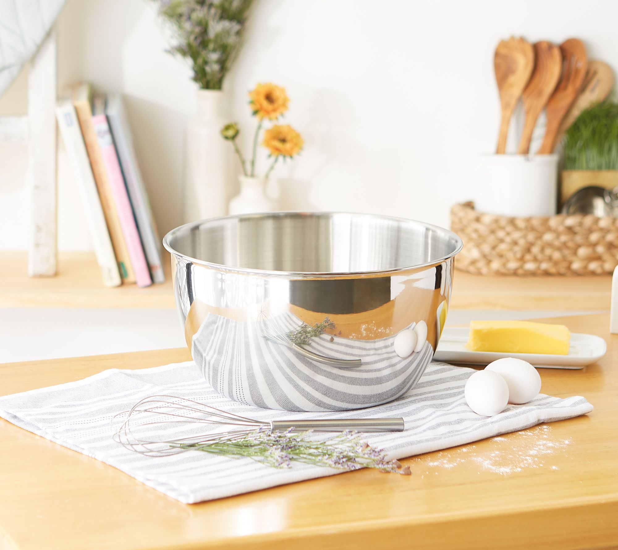 Mix a batch of batter or serve up a huge bowl of popcorn with this 12-qt stainless steel mixing bowl, it's dishwasher-safe and features a stable base and mirror finish. From RSVP.