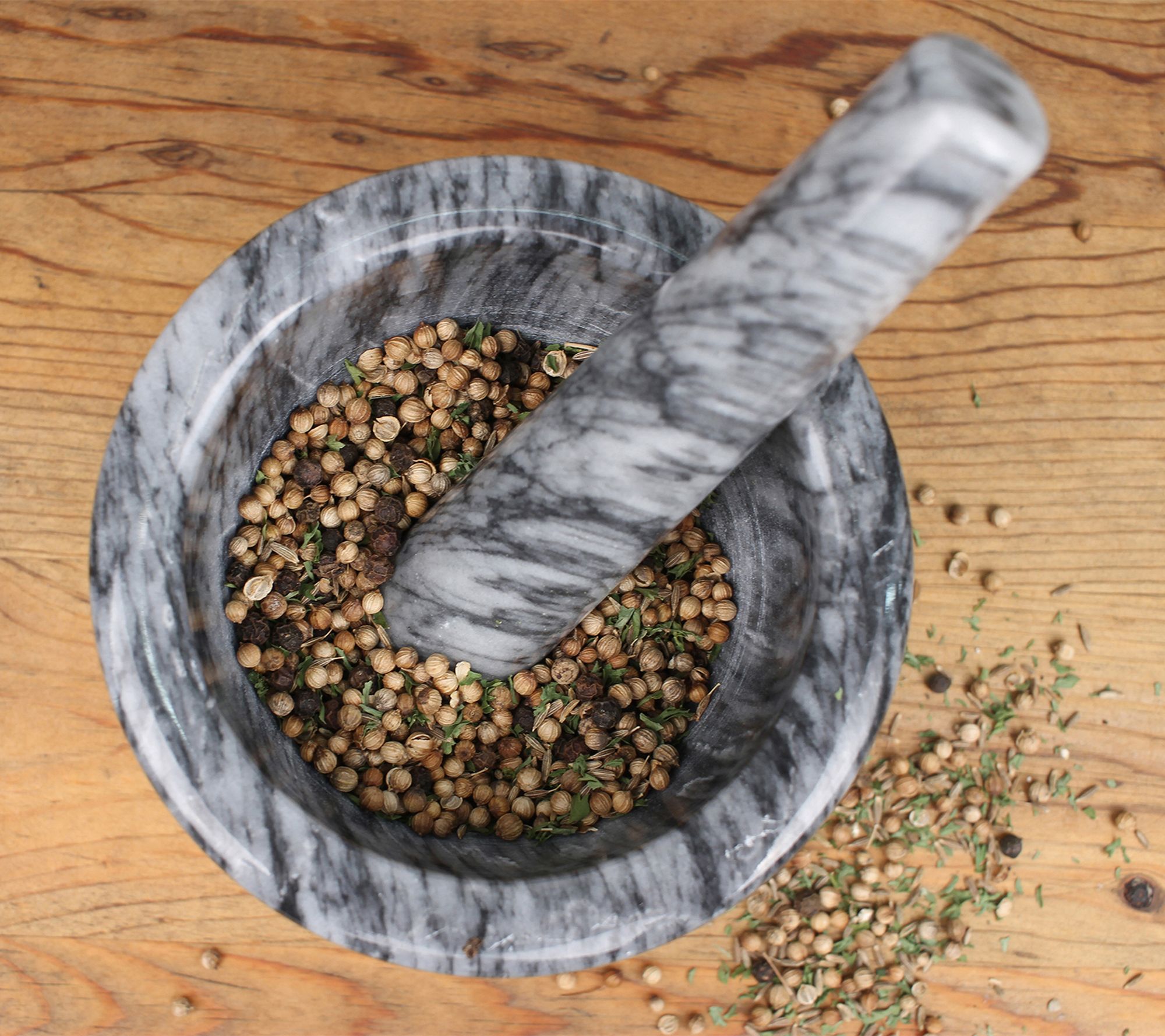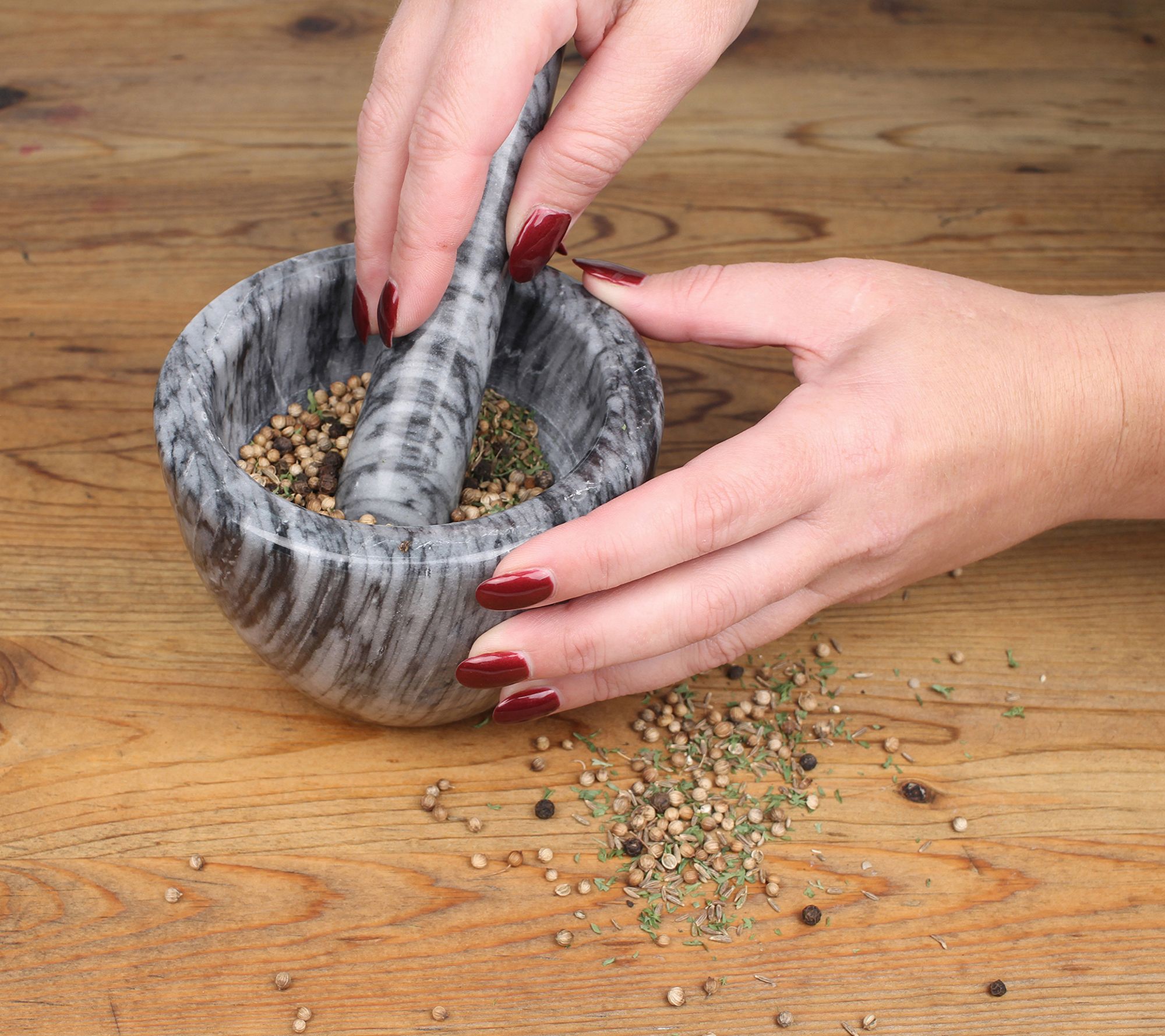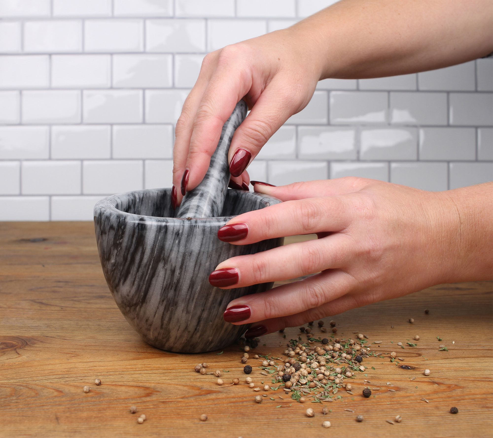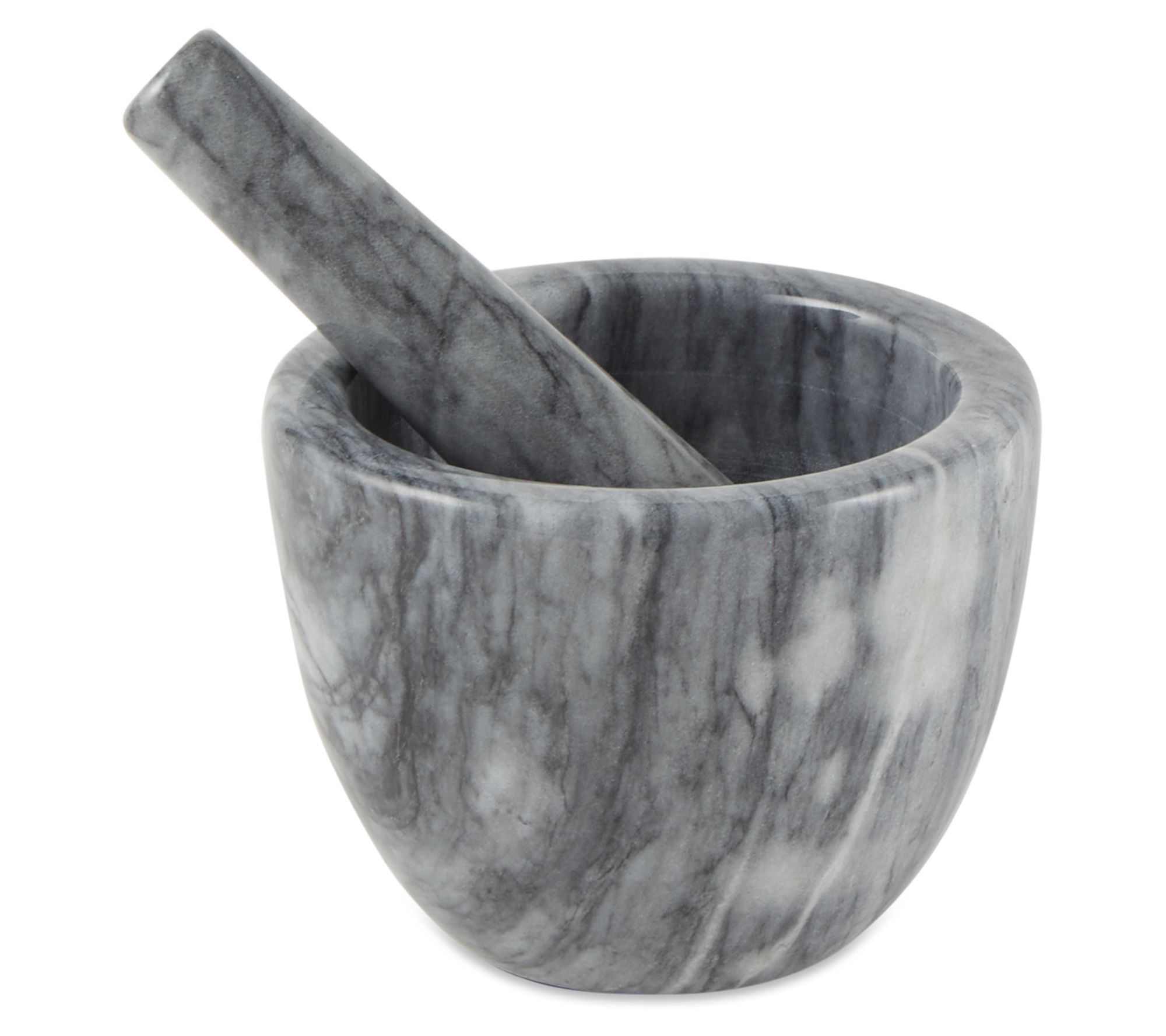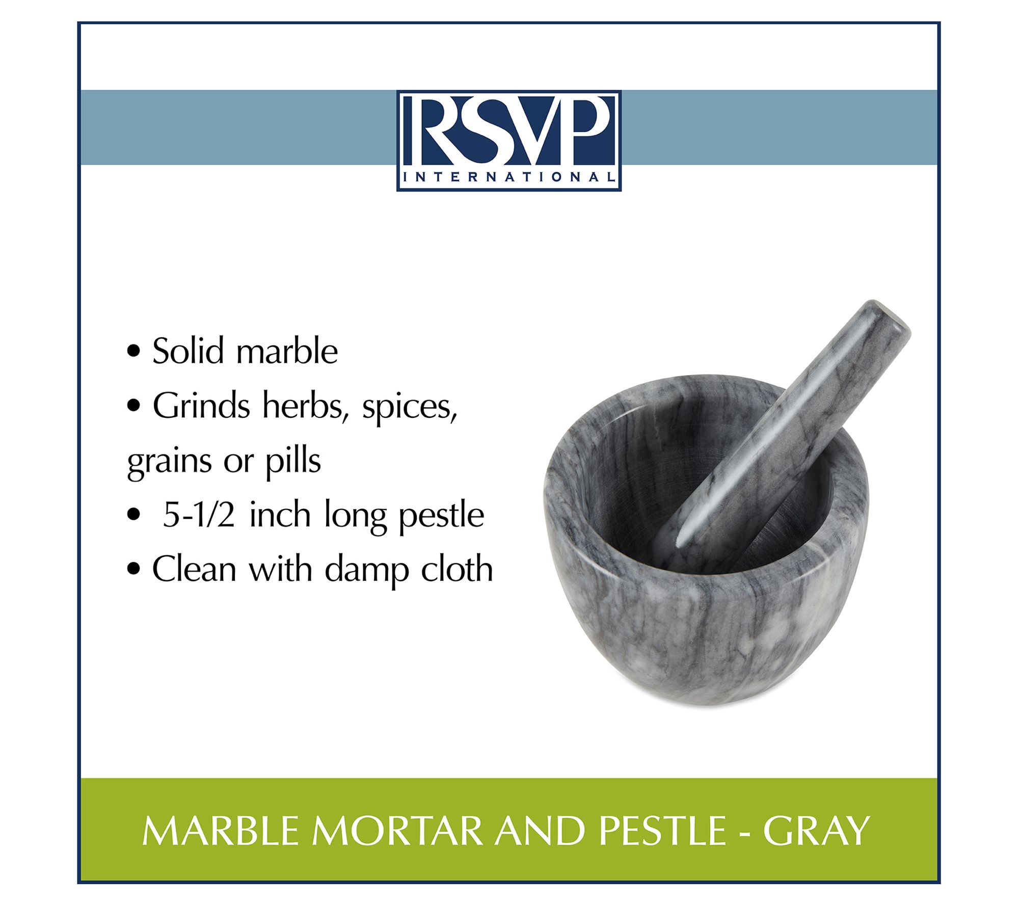 Grind herbs, make spicy rubs, or crush grains or pills in this beautiful 6-oz marble mortar and pestle. From RSVP.