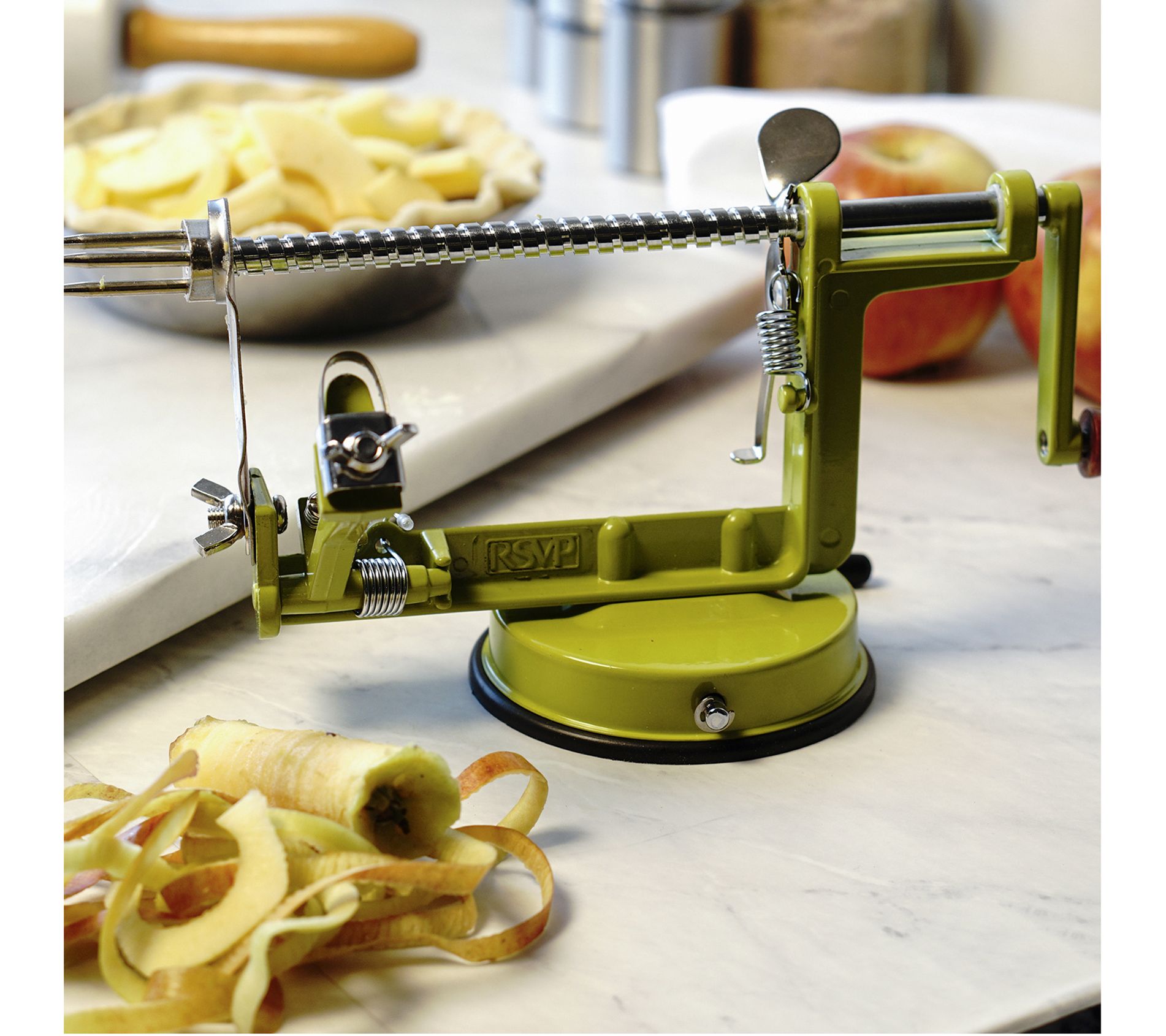 Perfectly peeled, cored and sliced apples are a breeze with this handy crank-operated kitchen gadget, the suction base keeps it stable and it's fun to use. From RSVP.