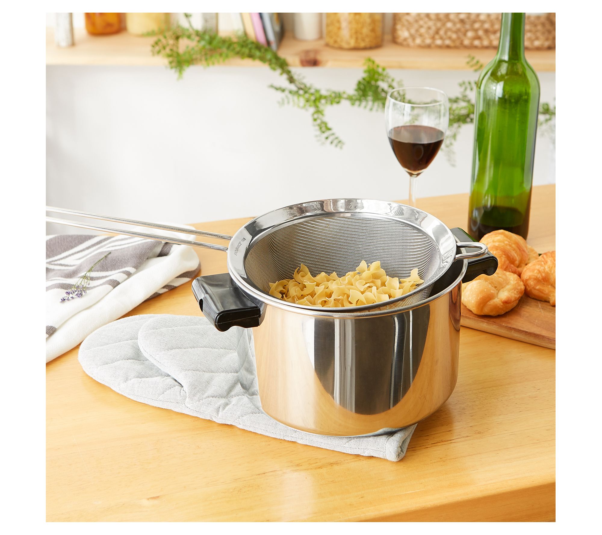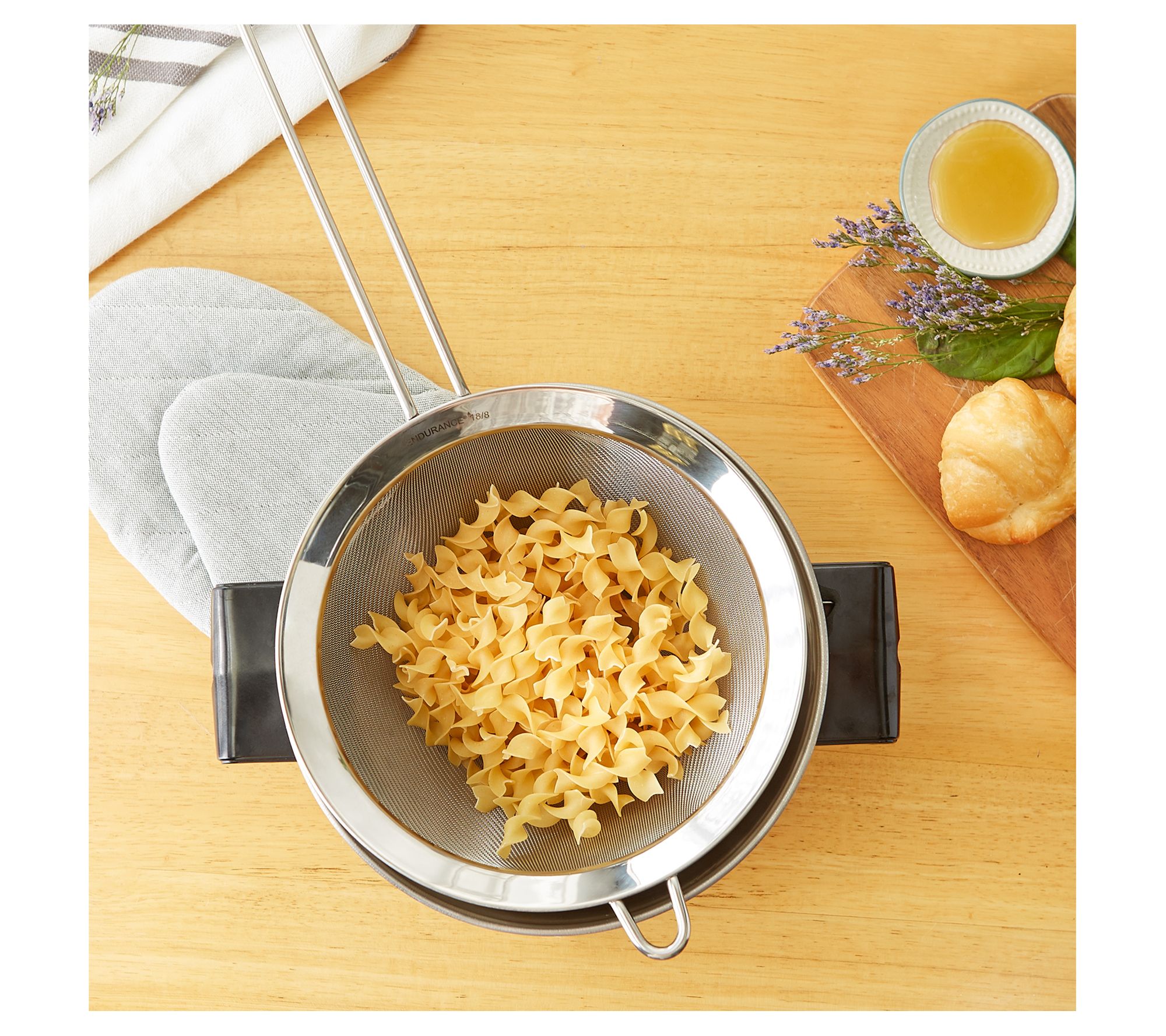 Ideal for straining broth, juice, tea, canned fruit, beans, vegetables, and pasta, this mesh stainless-steel strainer is a must-have for every kitchen. From RSVP.