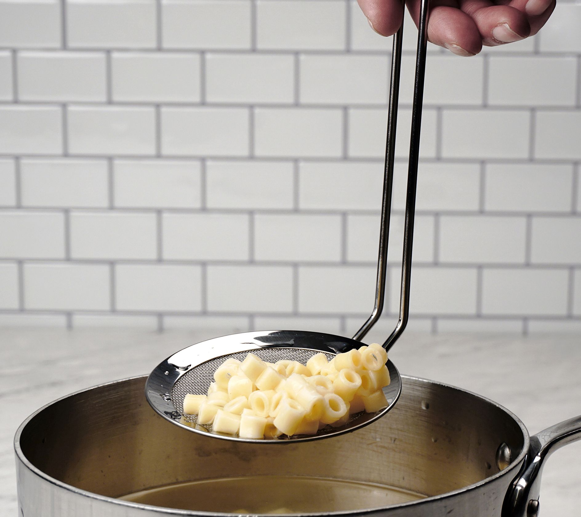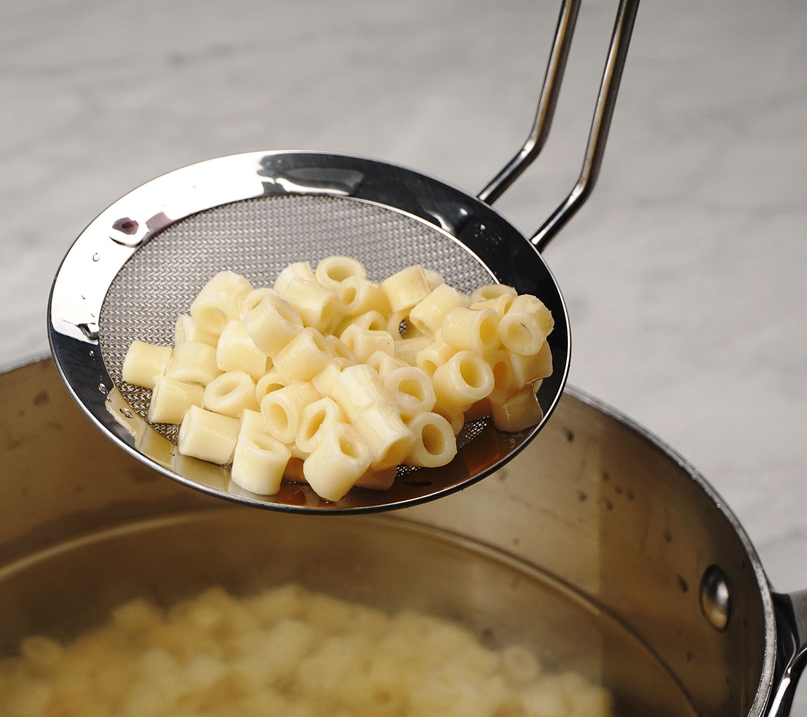 Scrap the spoon! This double-fine mesh skimmer easily navigates the corners and sides of your cookware, straining even the tiniest of unwanted bits from your next meal. From RSVP.