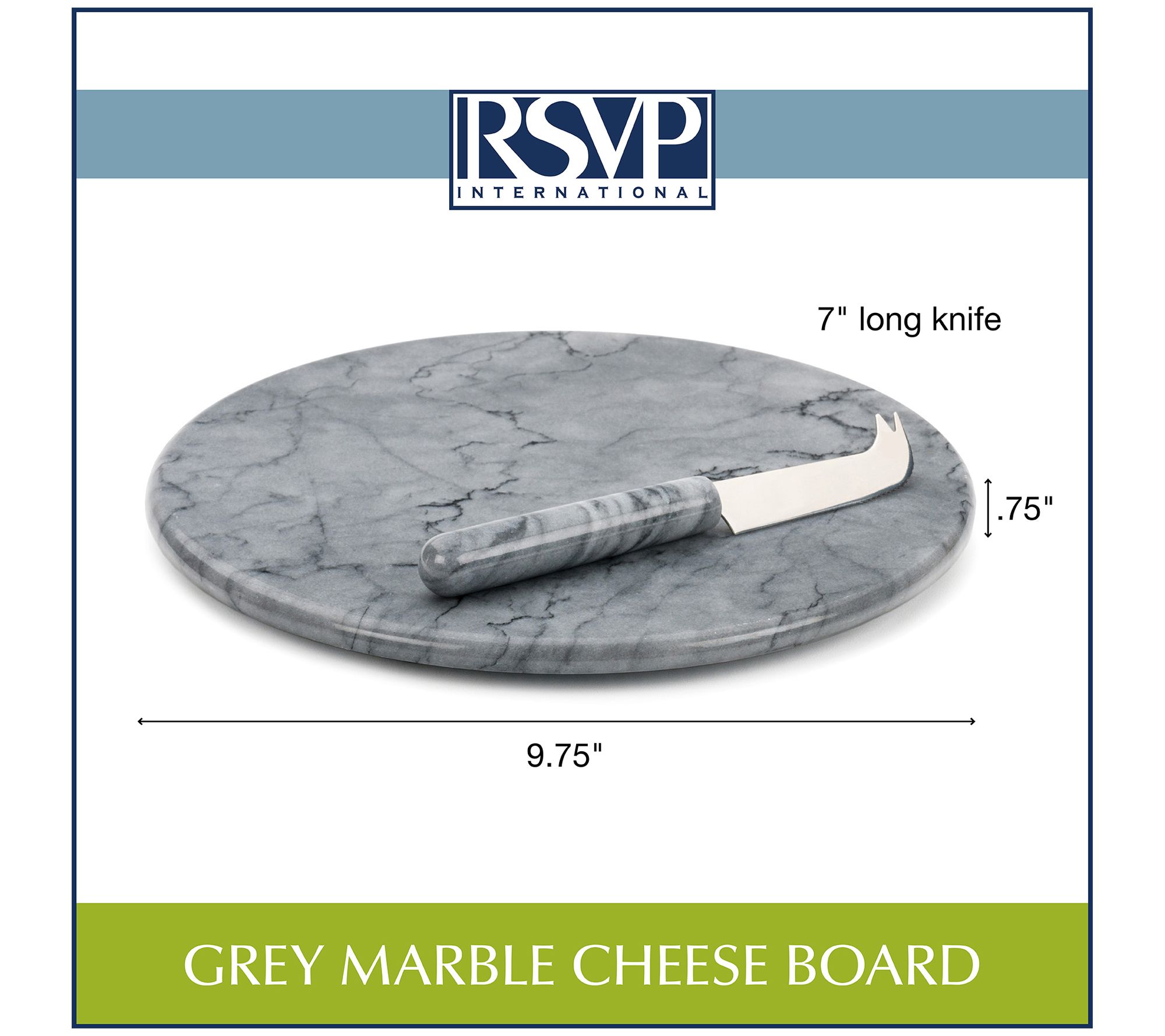 • Measurements: Board 9.75"Diam x 0.75"H; Knife 7"L