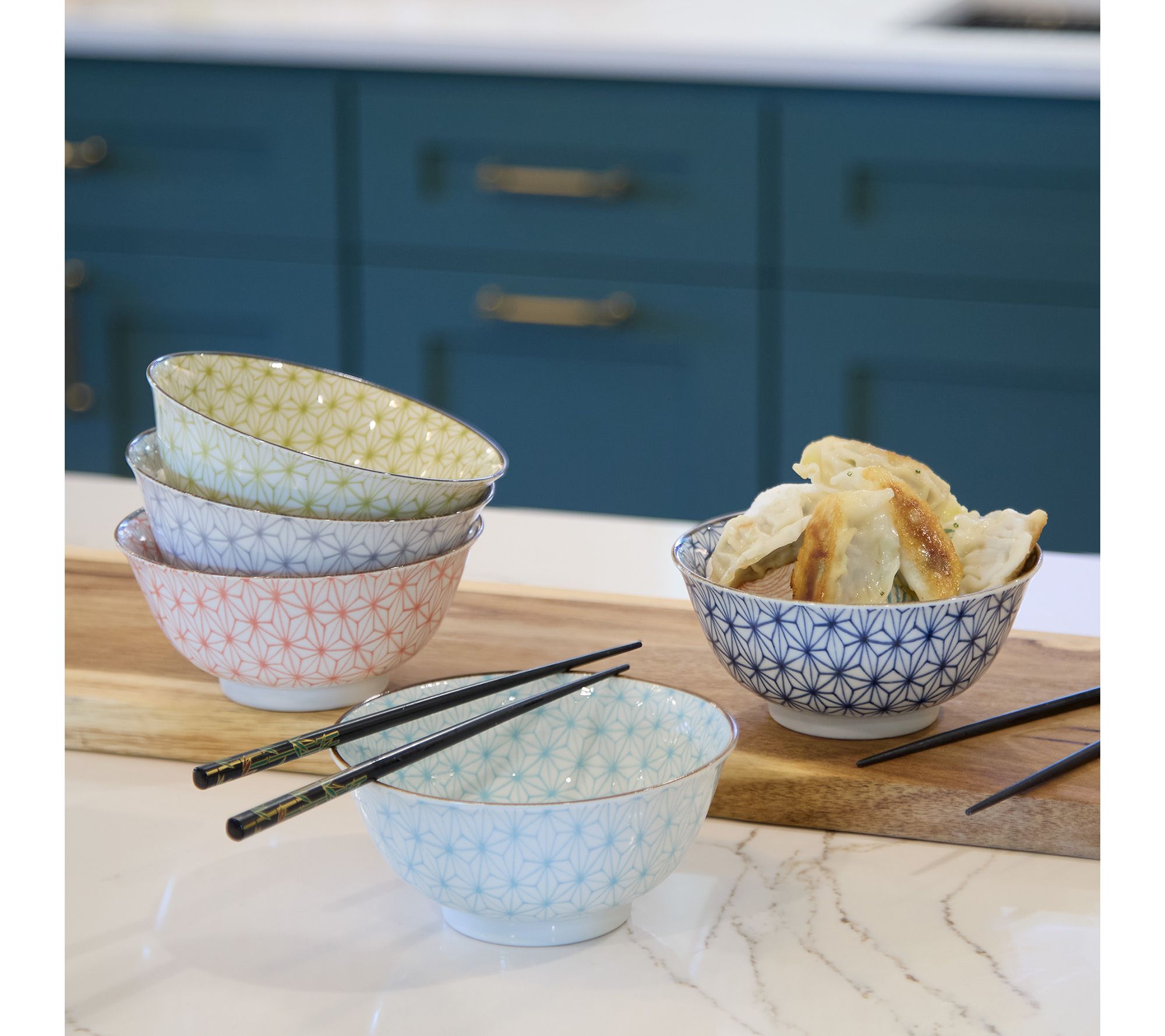 Imagine delighting your guests with a beautiful array of vibrant patterns at your dinner table. This set of five 12-oz Japanese porcelain bowls offers a seamless geometric star design, perfect for serving rice, vegetables, or noodle dishes. From RSVP.