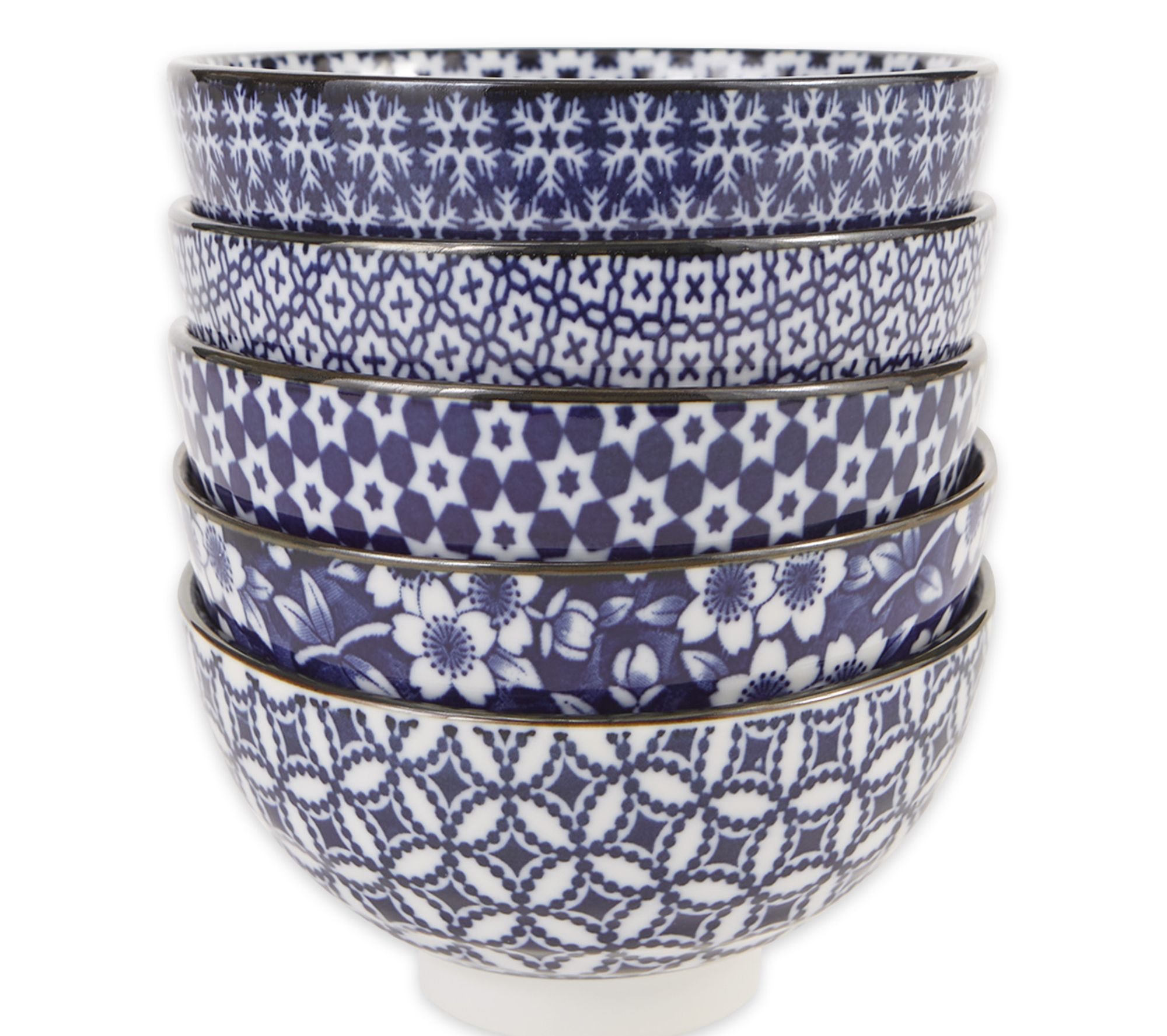Add an elegant touch to your dining collection with this set of five Japanese porcelain bowls. Featuring beautiful traditional patterns, these bowls are versatile enough for rice, vegetables, noodles, and more. Enjoy the convenience of microwave- and dishwasher-safe functionality, making cleanup a breeze. From RSVP.