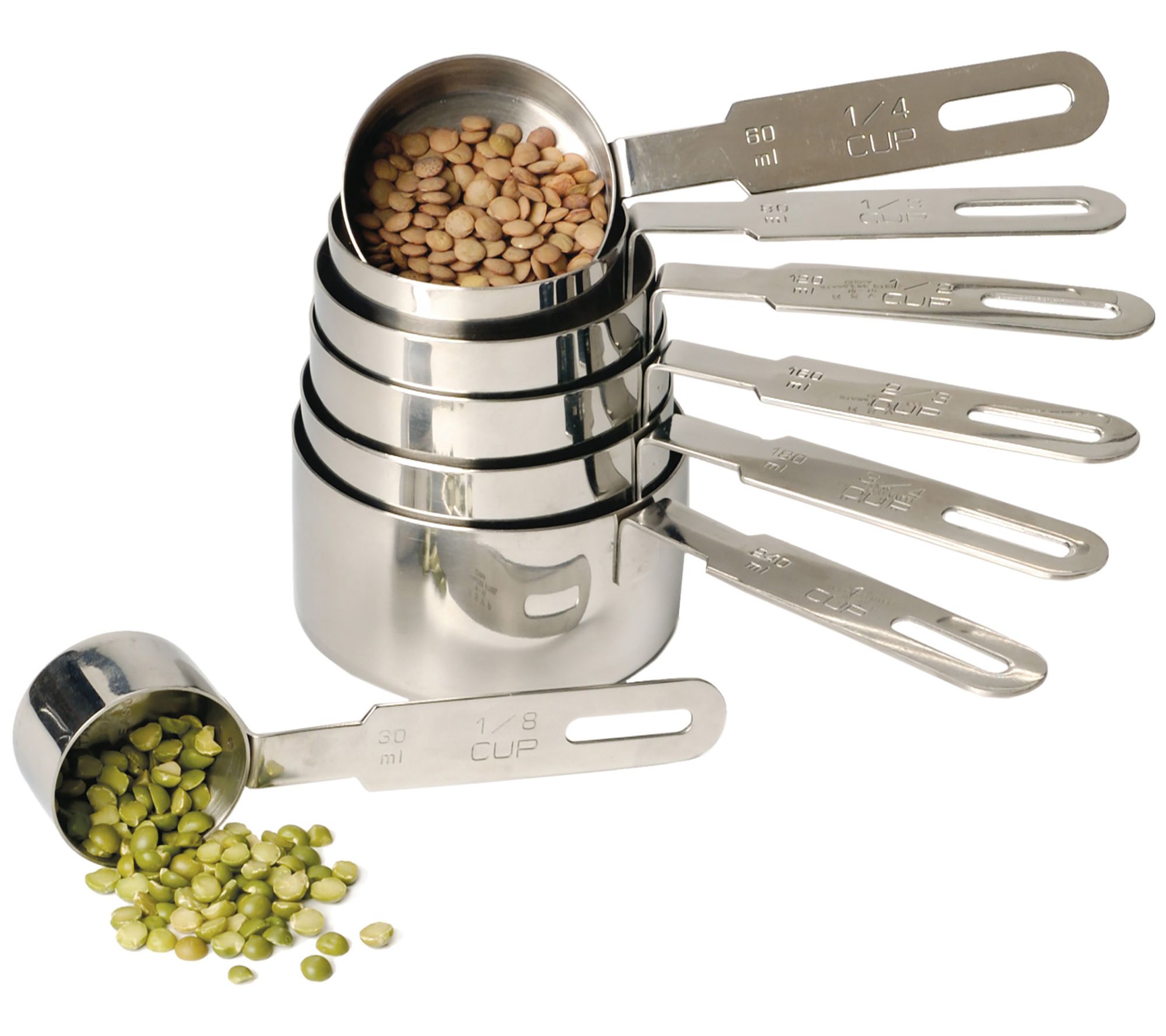 • Includes seven measuring cups in 1-, 3/4-, 2/3-, 1/2-, 1/3-, 1/4-, and 1/8-cup sizes