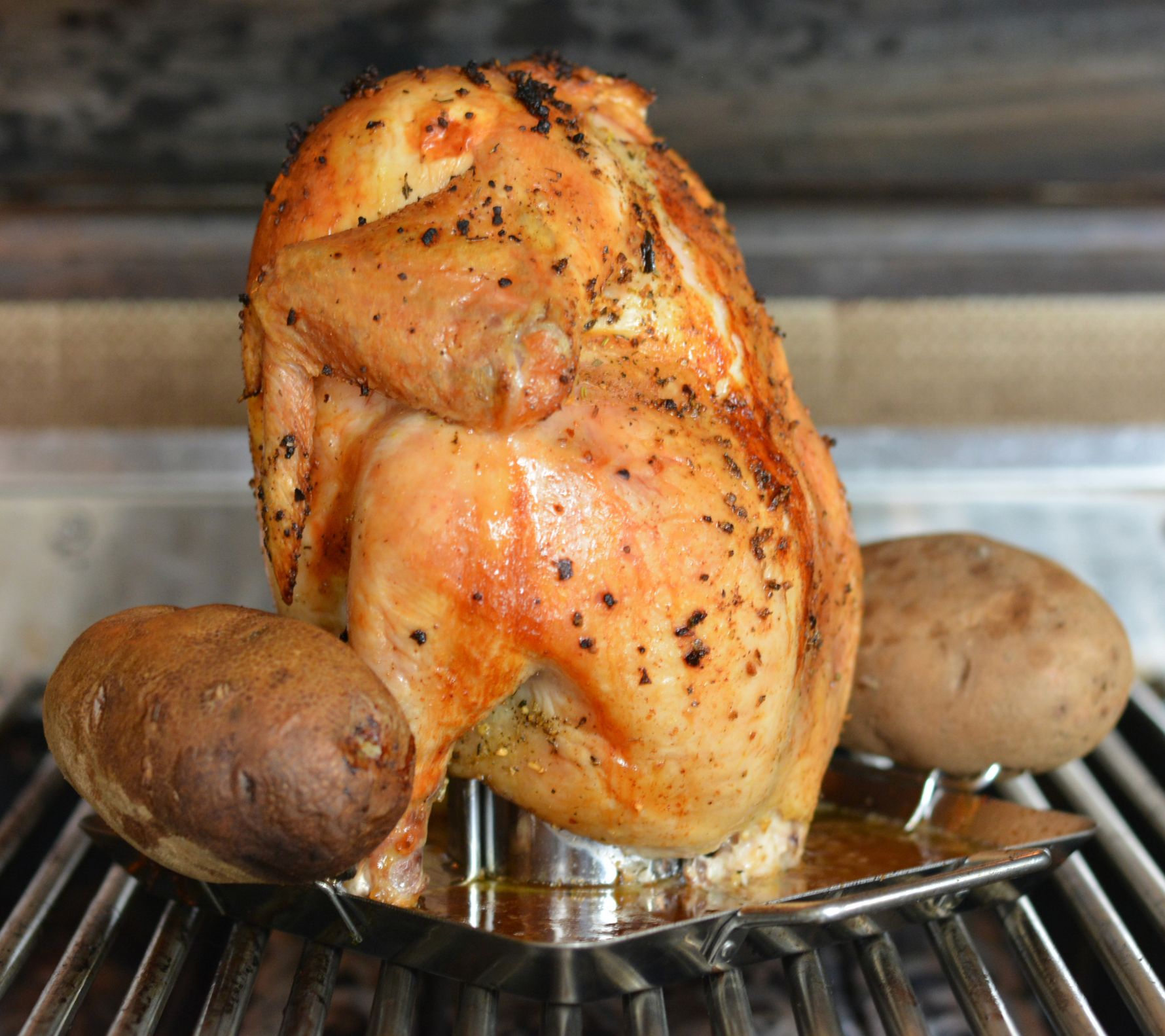 Make delicious roasted chicken on the grill effortlessly with this vertical roaster. Infuse your poultry with beer, wine, or broth -- the tray collects drippings and prevents flareups. From RSVP.