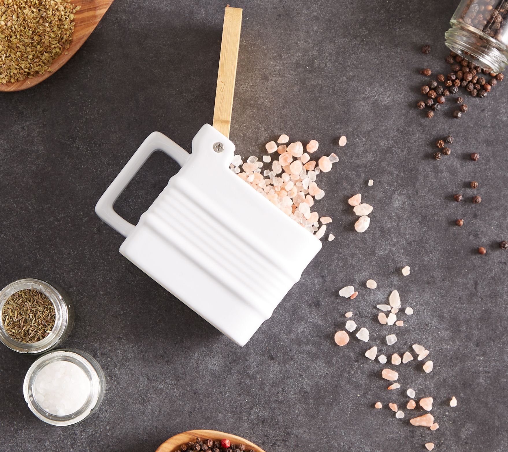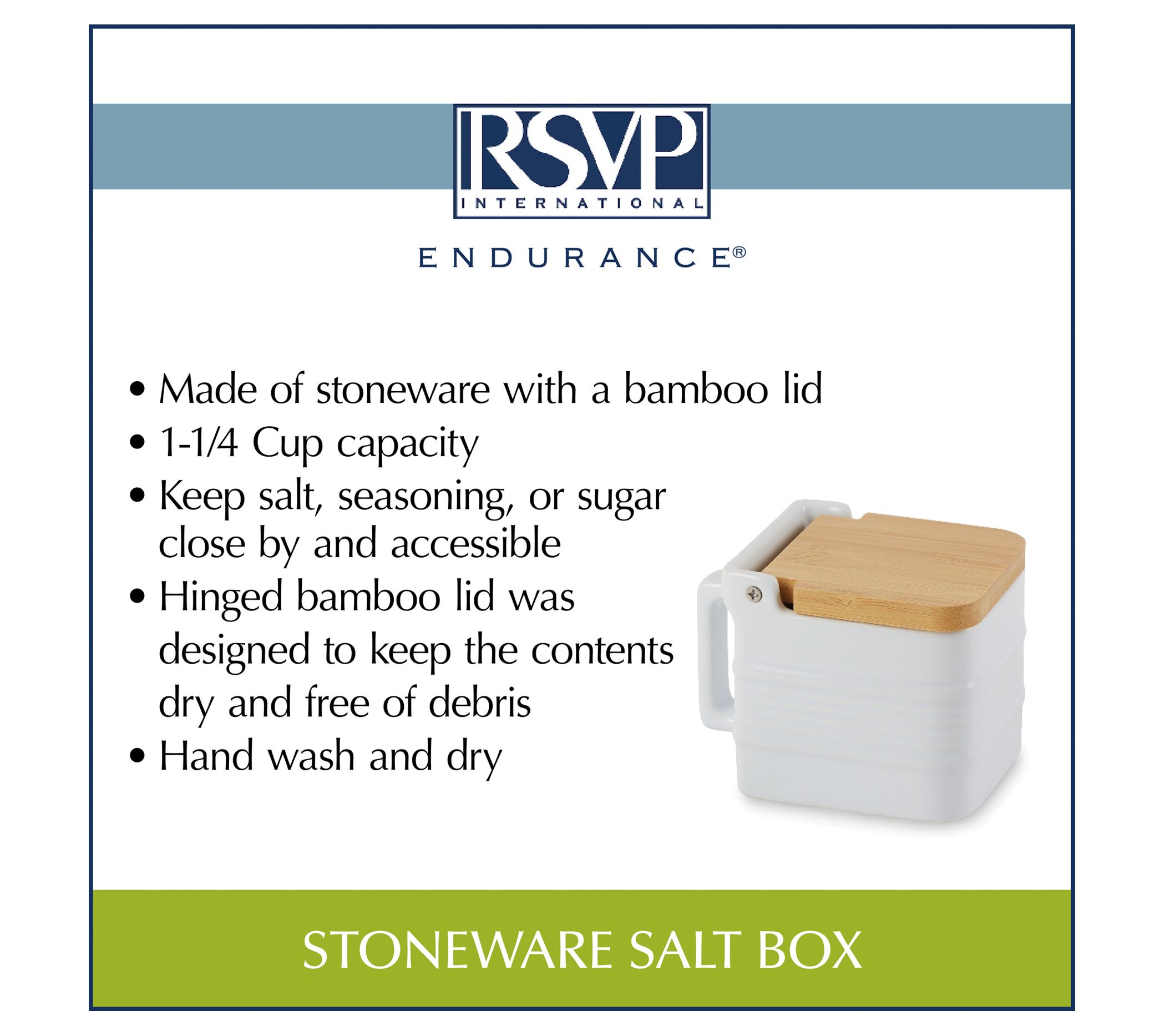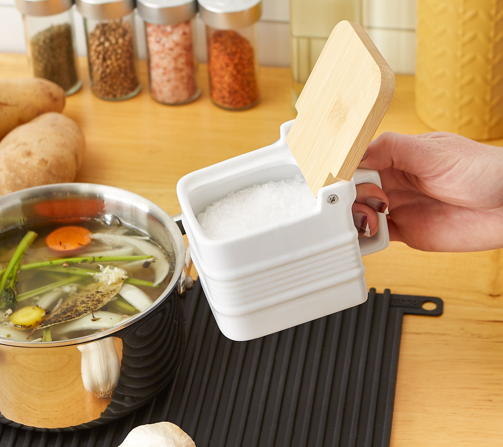 Keep your Celtic gray or pink Himalayan within easy reach when you have this stylish stoneware and bamboo salt box, also great for flavored sugars or dried herbs. From RSVP.