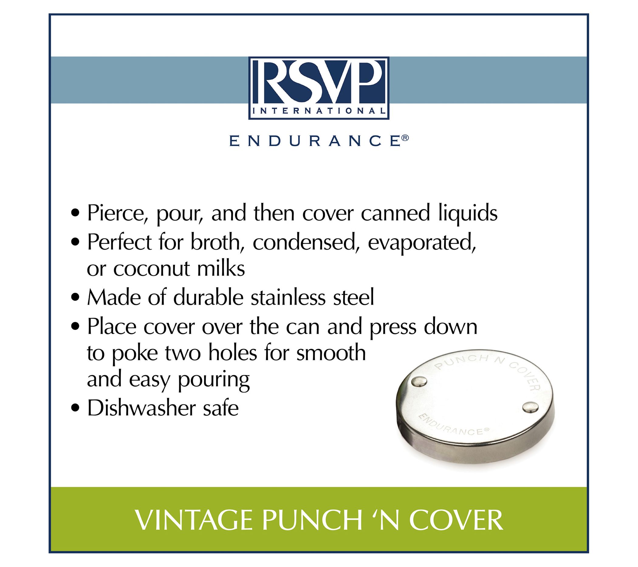 Punch, pour, and cover canned liquids like broth, coconut milk, or sauce with this vintage-inspired kitchen tool that helps keep food fresh. From RSVP.