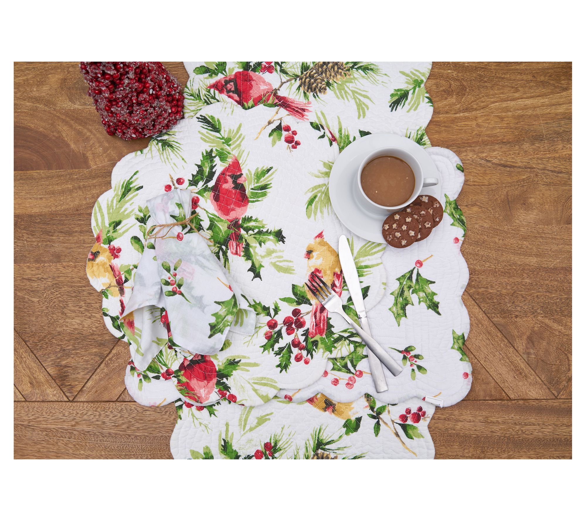Set the scene for a festive holiday gathering with these enticing round placemats. Crafted to inspire coziness, each piece features a lively red and yellow cardinal motif set against festive holly leaves. The reversible design showcases a charming holly berry pattern on the back, offering versatility and extra cheer. Imagine welcoming friends and family to dine around a table set with seasonal joy, and let the spirit of the Ruby Cardinal collection help create unforgettable memories. From the Valerie Parr Hill Collection.
