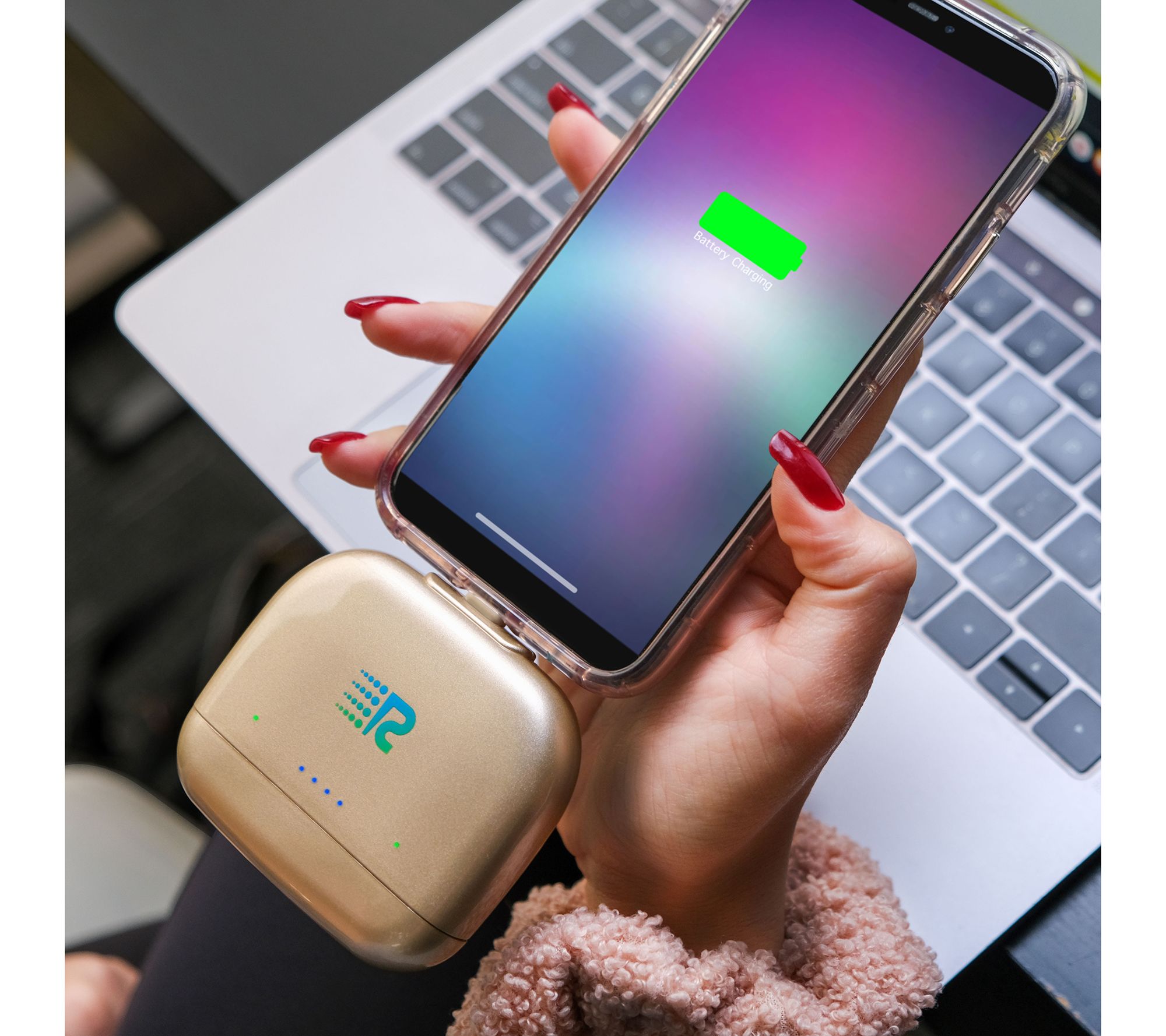 Includes micro USB Rush Charge portable charger and wireless earbuds