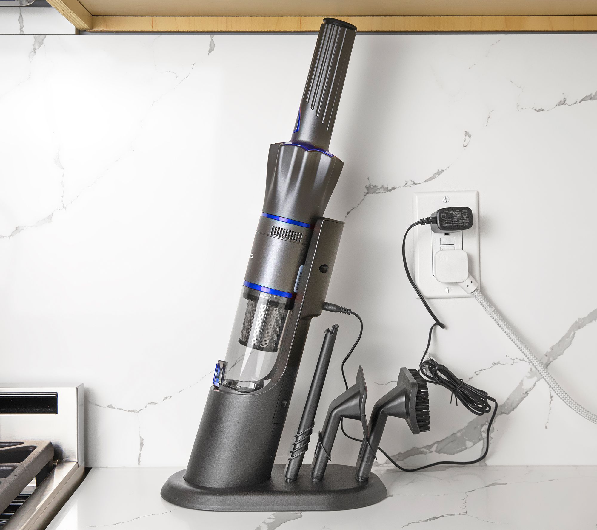 Includes cordless handheld vacuum, charging station, 23" flexible nozzle, 6" tapered crevice nozzle, brush nozzle, and upholstery nozzle