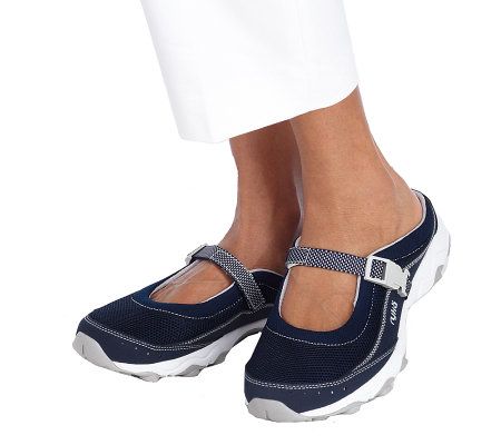 Sporty style. These breathable, fabric-and-mesh Rykas take the classic, feminine Mary Jane silhouette and give it an active edge. The open-back, slip-on design allows easy on and off access: just the thing for your busy, on-the-run lifestyle. Choose from two fun fashion colors and three neutral basics.