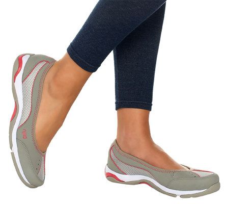 Walk on! Blending casual flair with foot-pampering features, these leather and mesh skimmers are poised to become the go-to shoes of your summer wardrobe. Sport them at an outdoor shindig, on your errands--wherever the day takes you! The slip-on style allows you to head out the door in a flash, while the solid rubber outsole offers the durability to carry you every step of the way.