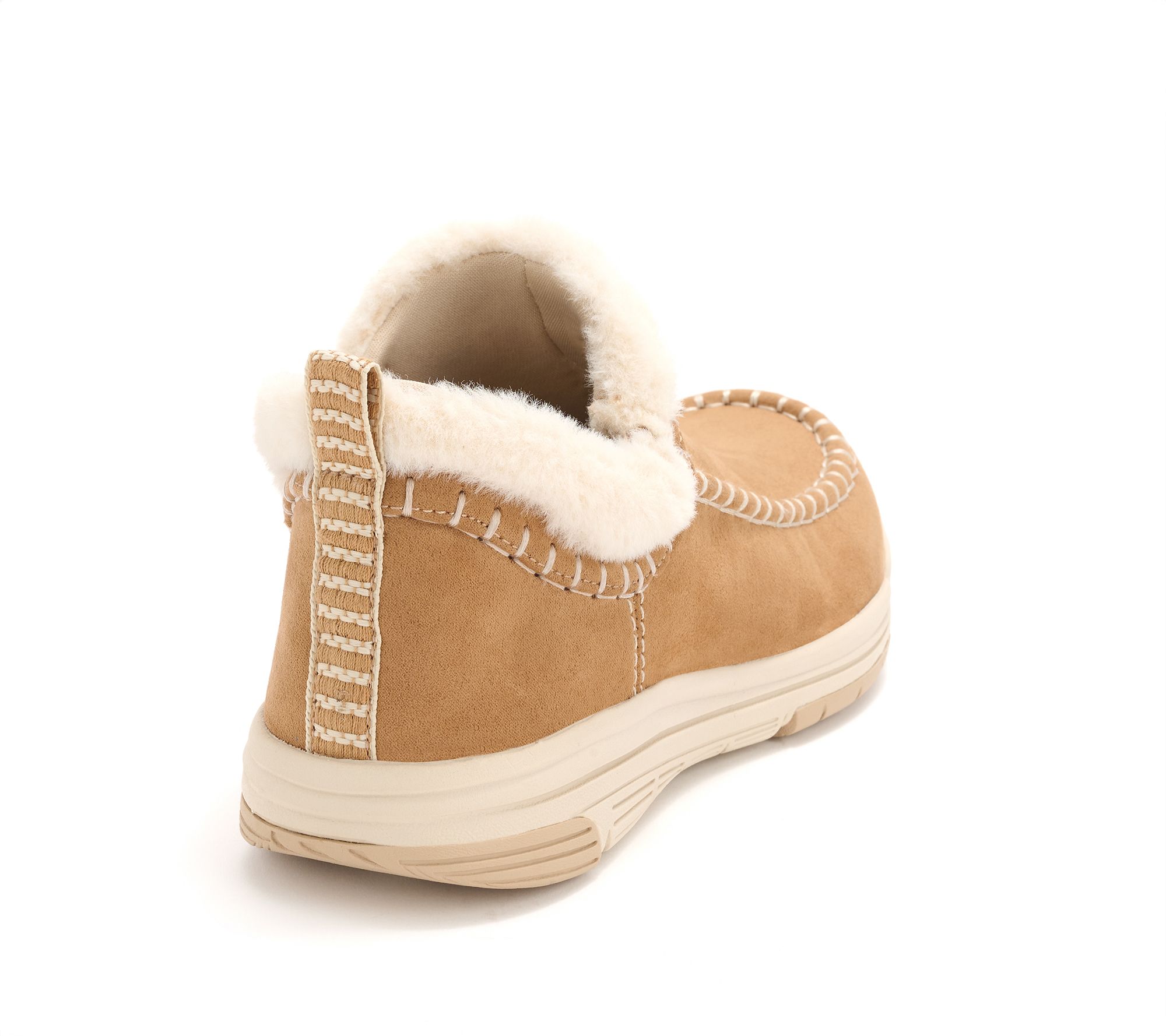 • Water-repellent microfiber upper, moc stitch details, faux-fur collar with webbing, slip-on style, stretch gore