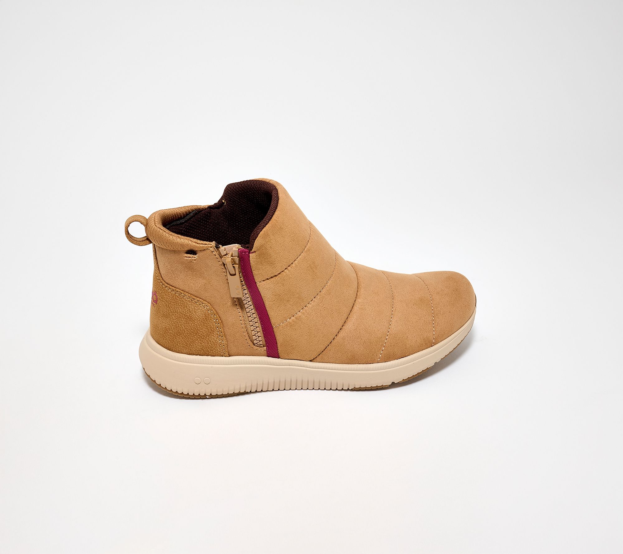 • Water-repellent padded microfiber upper, faux leather heel patch, side zipper, heel pull