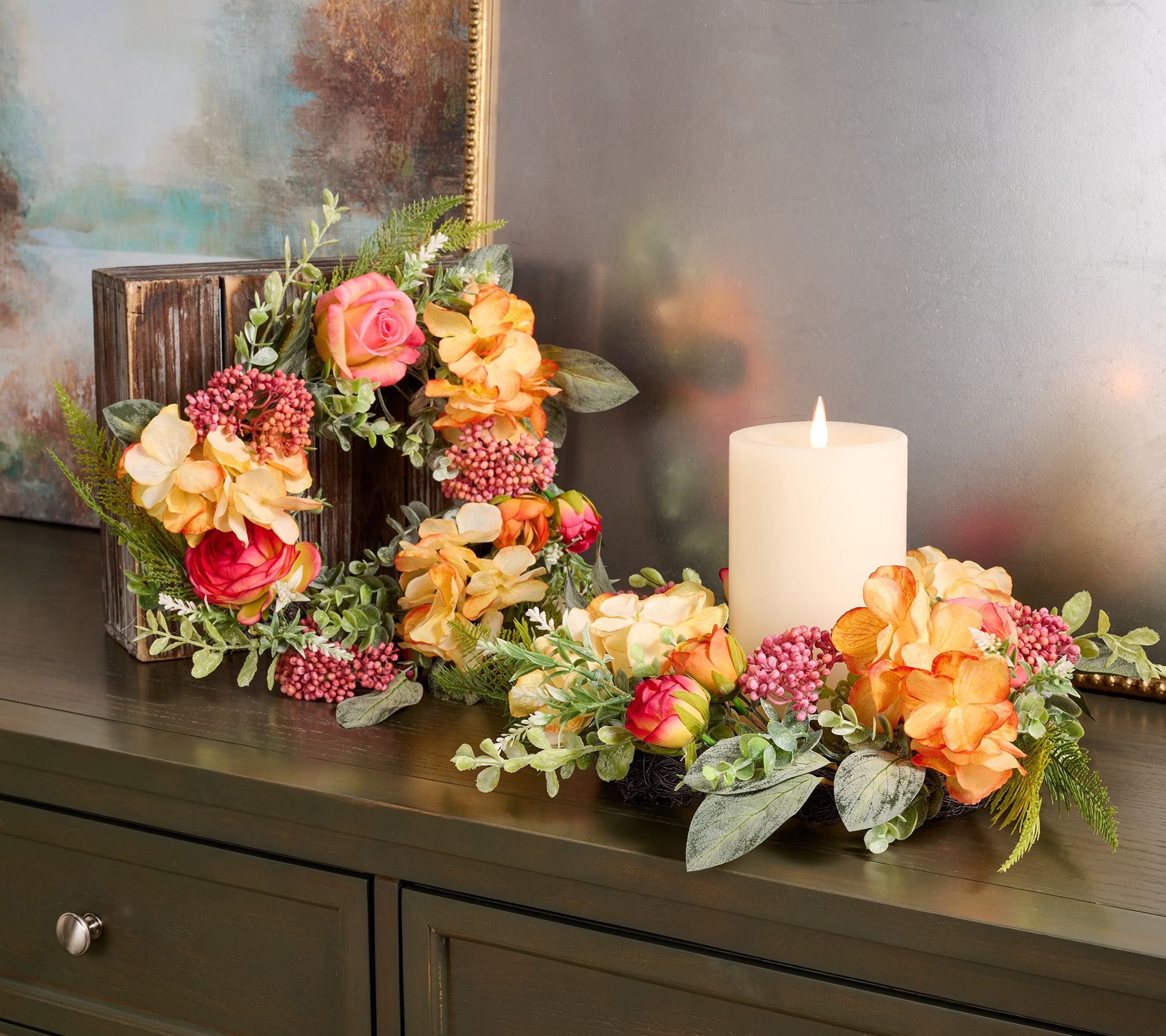 Brighten up your living space or centerpiece with these stunning candle rings, brimming with cheerful faux hydrangeas, ranunculus, roses, and lush greenery in sunny yellows and corals. Layer them around your favorite flameless pillars for a burst of color that lasts all season, welcoming guests with a vibrant, garden-inspired touch. From the Valerie Parr Hill Collection.