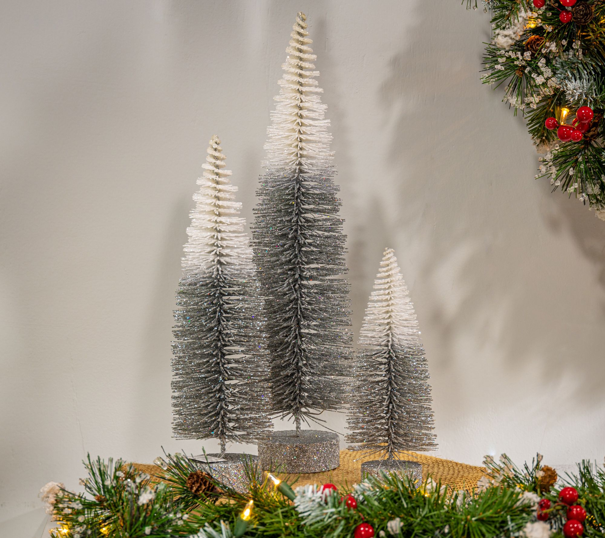 Add a crisp touch of winter style to your home with these bottle brush trees. Finished in a glittering ombre they will add a vintage look to your decorations. From Gerson Co.