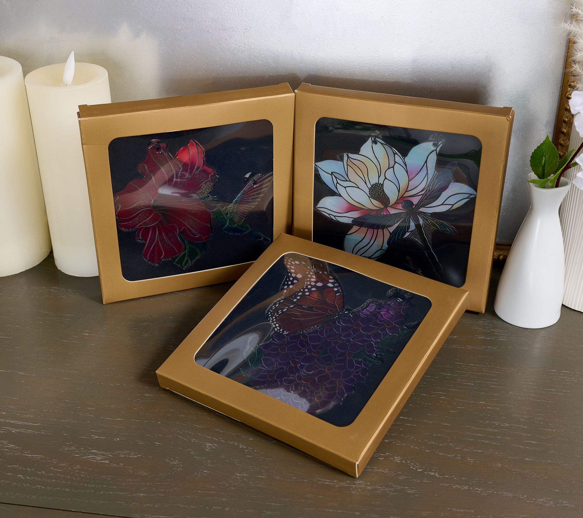 • Includes three window hanging suncatchers and three gift boxes