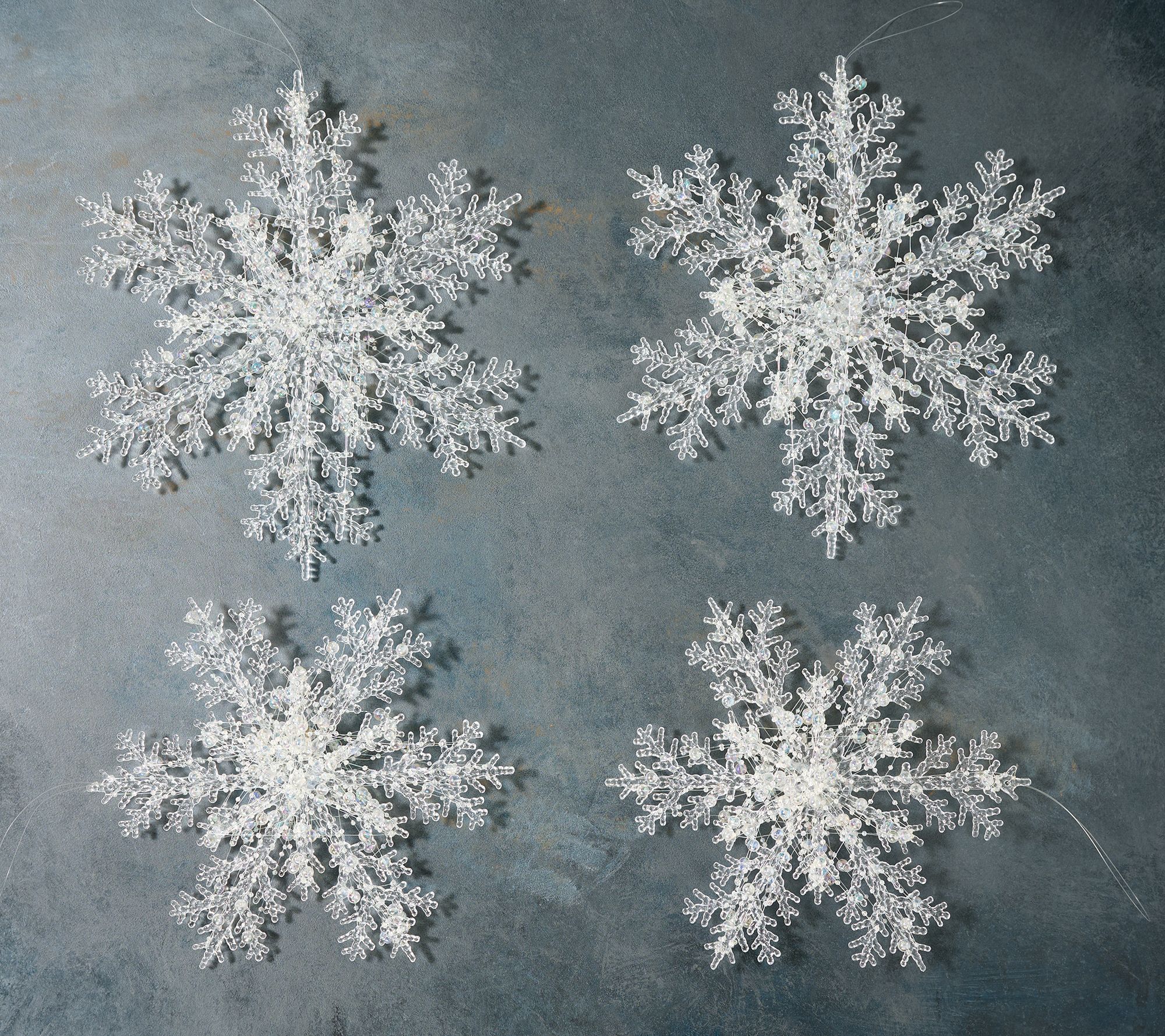 • Includes four iridescent beaded snowflake ornaments