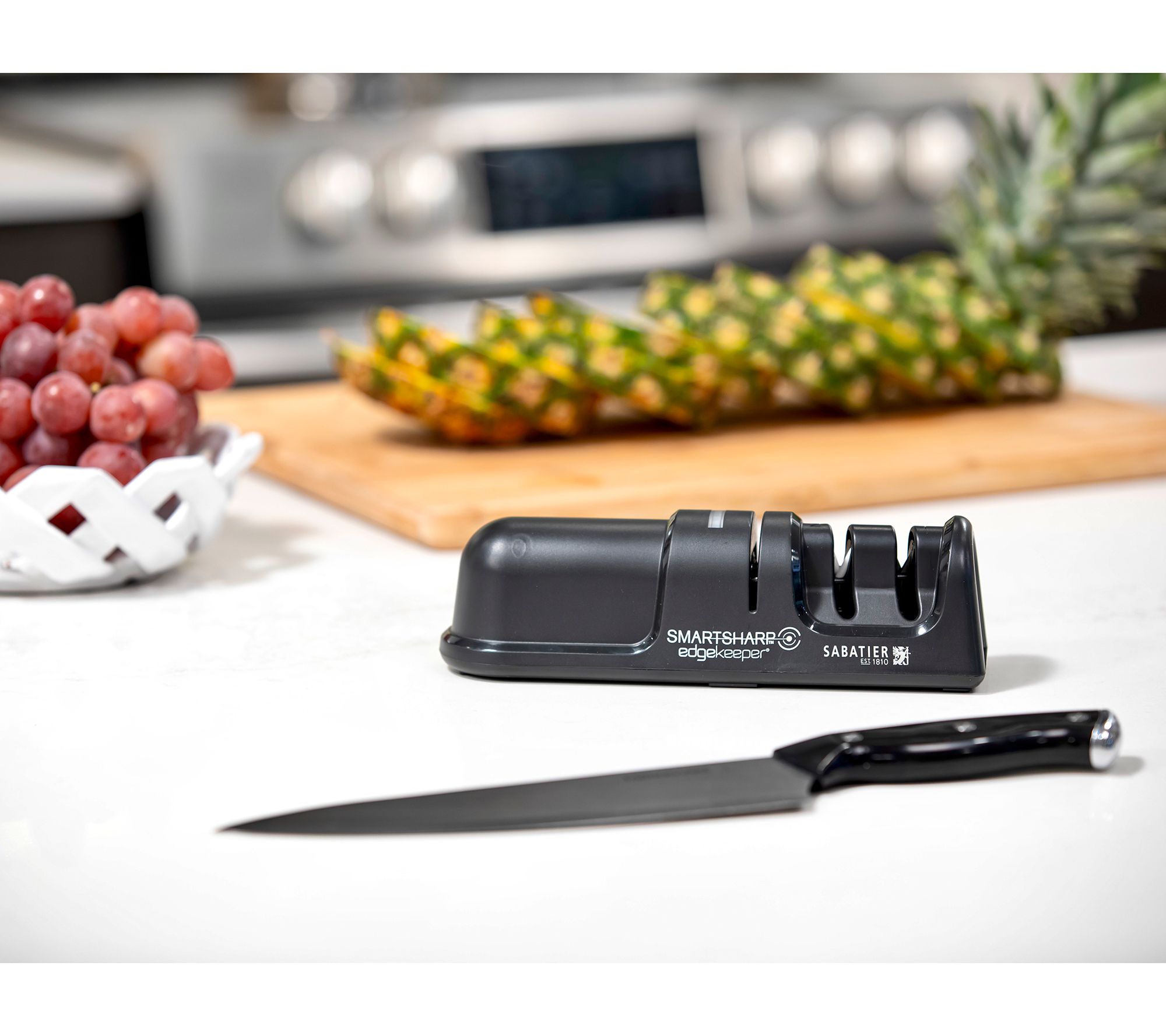 Featuring a two-stage process that sharpens and polishes your cutlery, the SmartSharp Knife Sharpener also includes LED optical light sensor technology to determine the sharpness of your blade. From Sabatier.