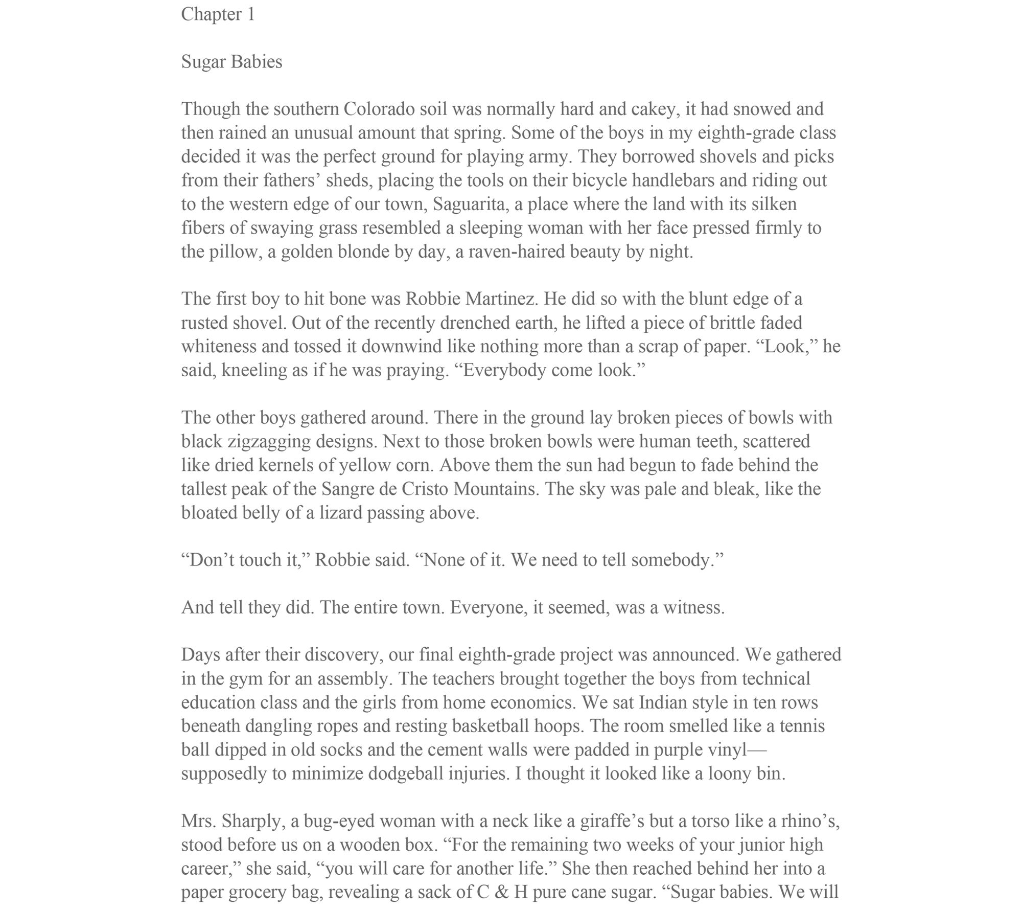 In "Sugar Babies," ancestry and heritage are hidden inside the earth but tend to rise during land disputes. "Any Further West" follows a sex worker and her daughter as they leave their ancestral home in southern Colorado only to find a foreign and hostile land in California. In "Tomi," a woman leaves prison and finds herself in a gentrified city that is a shadow of the one she remembers from her childhood. And in the title story, "Sabrina & Corina," a Denver family falls into a cycle of violence against women, coming together only through ritual.