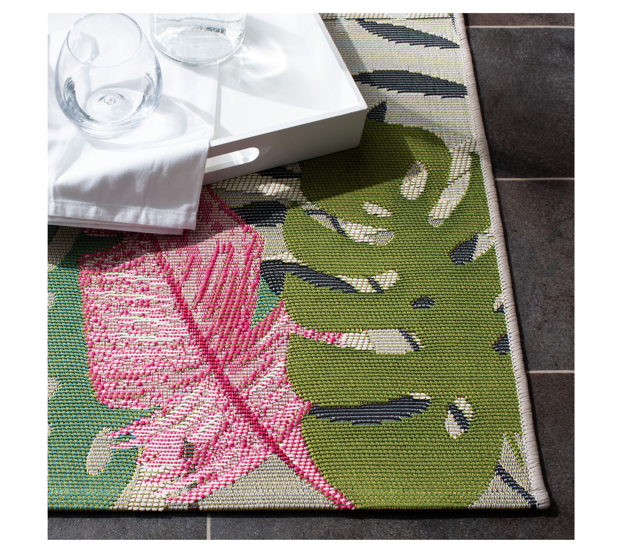 Brighten your home with the Safavieh Flamingo Bay rug that brings a slice of tropical paradise to your indoor or outdoor spaces. Bold pink flamingos and lush green leaves set against a sleek grey background create a striking focal point in any room or patio. Whether underfoot in your dining room or as the centerpiece on your deck, this playful and stylish rug adds a refreshing touch to your decor. From Safavieh.
