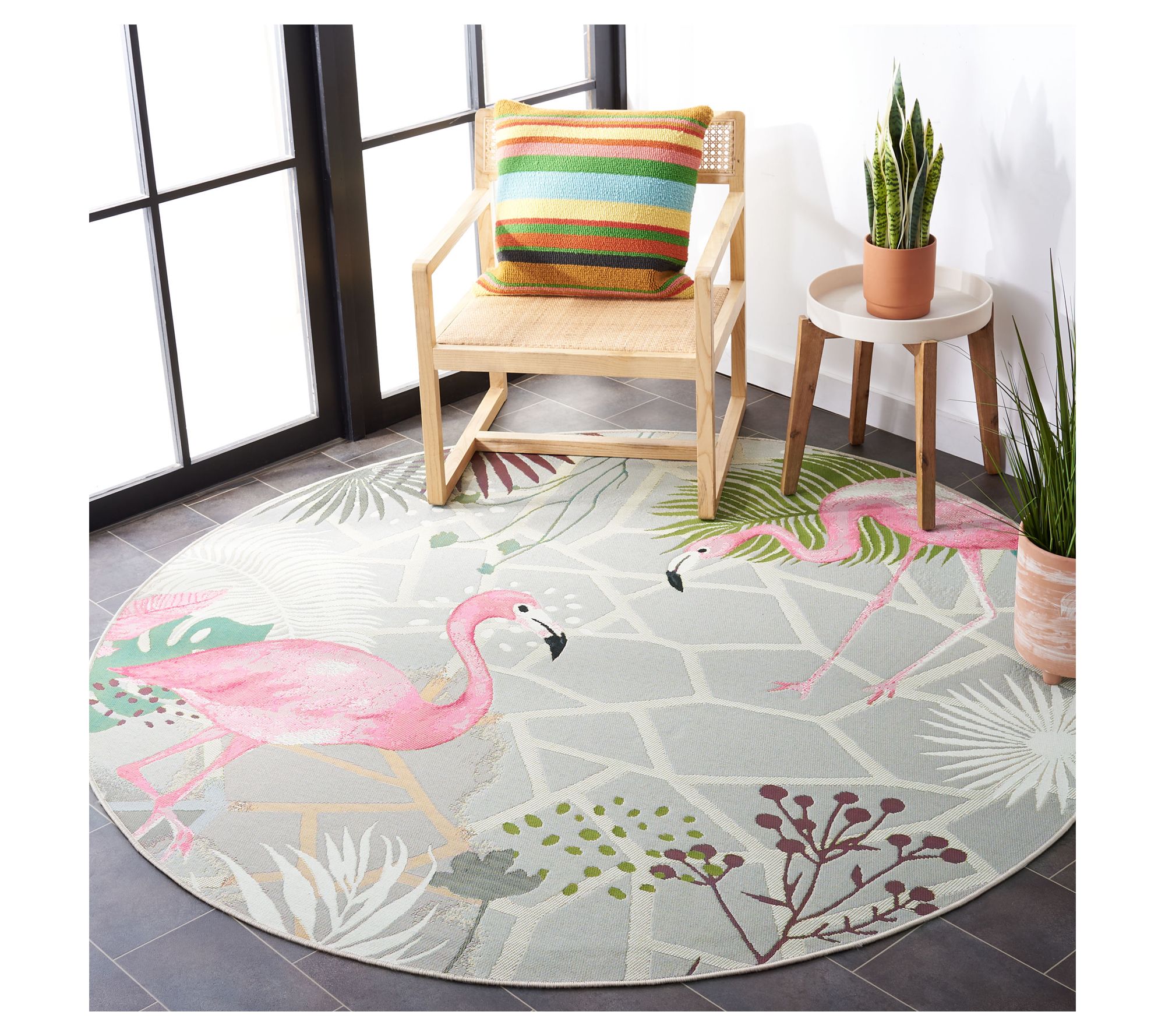 Transform your living space or outdoor area into a tropical paradise with the Flamingo Bay rug by Safavieh. Picture vibrant pink flamingos gracefully posed among lush green leaves, all set against a chic grey background. This striking round rug joyfully infuses any room or patio with vivid color and contemporary flair. Perfect for both indoor and outdoor settings, it’s easy to clean, simply hose it off and hang it to dry. From Safavieh.