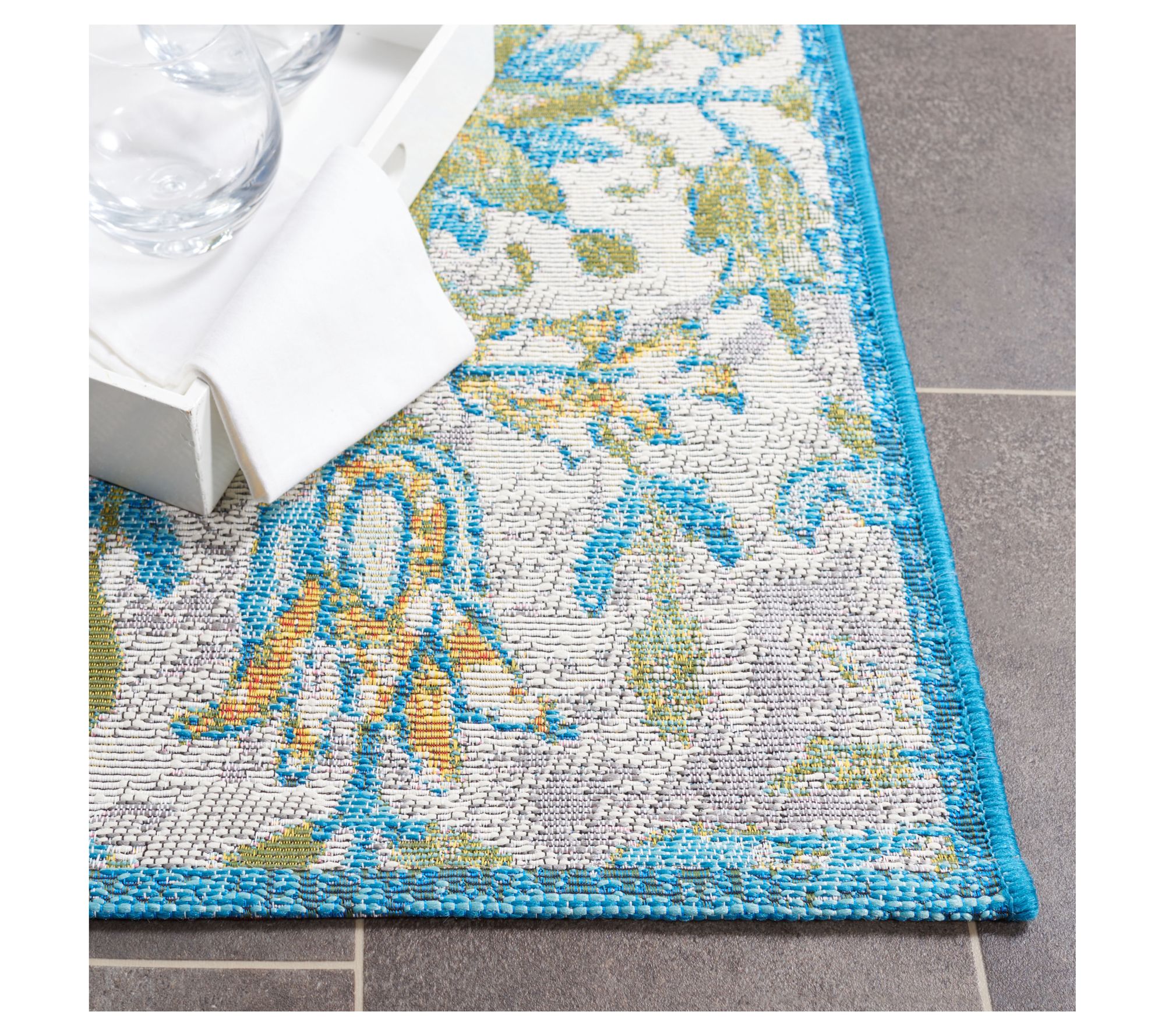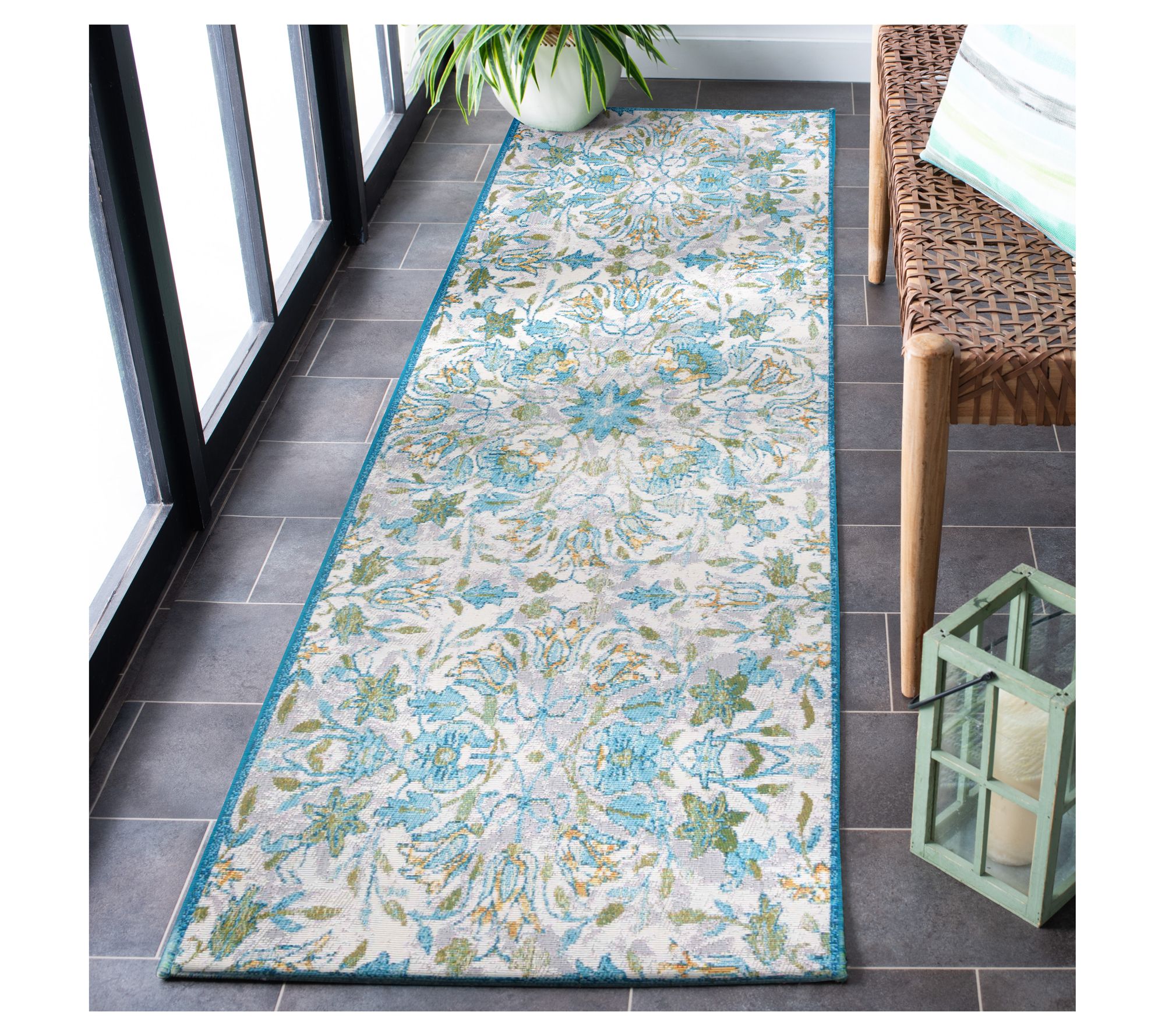 Turn your living area into a sanctuary with the beautiful Barbados Tropica rug from Safavieh. Graceful floral motifs in shades of ivory, light blue, and soft gold transform any space into a serene retreat. This rug is designed to withstand the elements, making it a perfect addition to both your indoor and outdoor areas. Simply hose it off and hang dry to keep it looking fresh and lovely. From Safavieh.