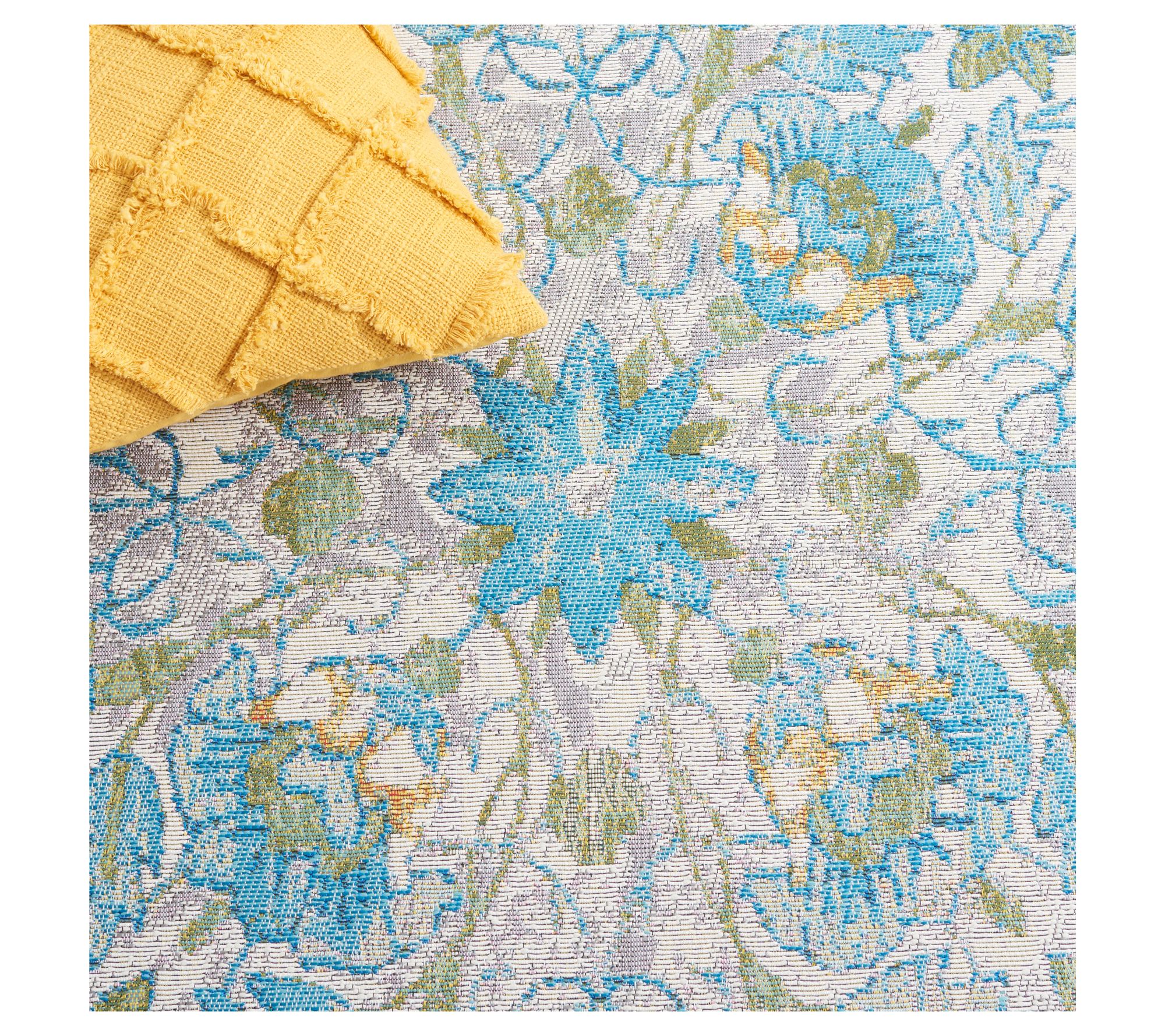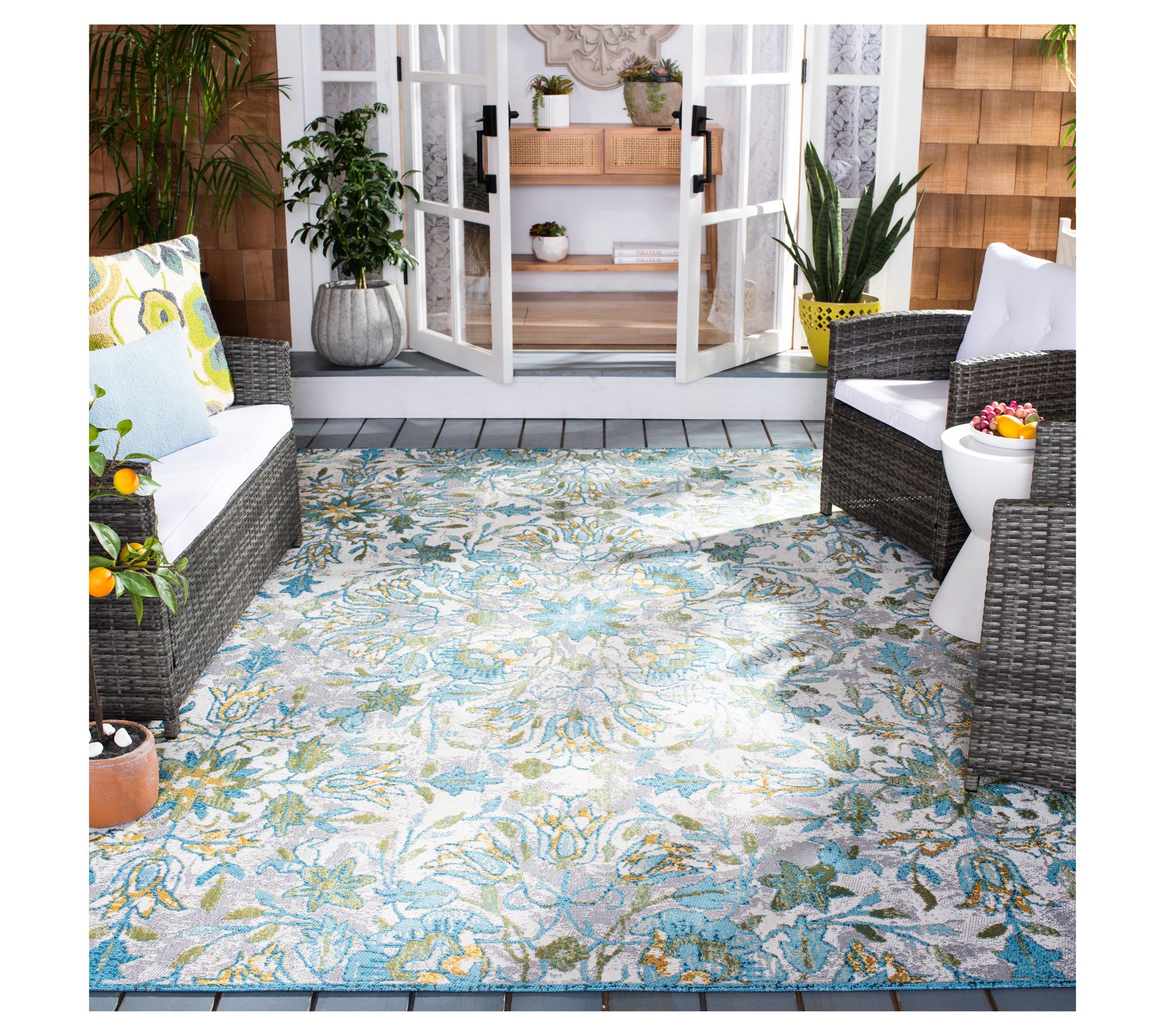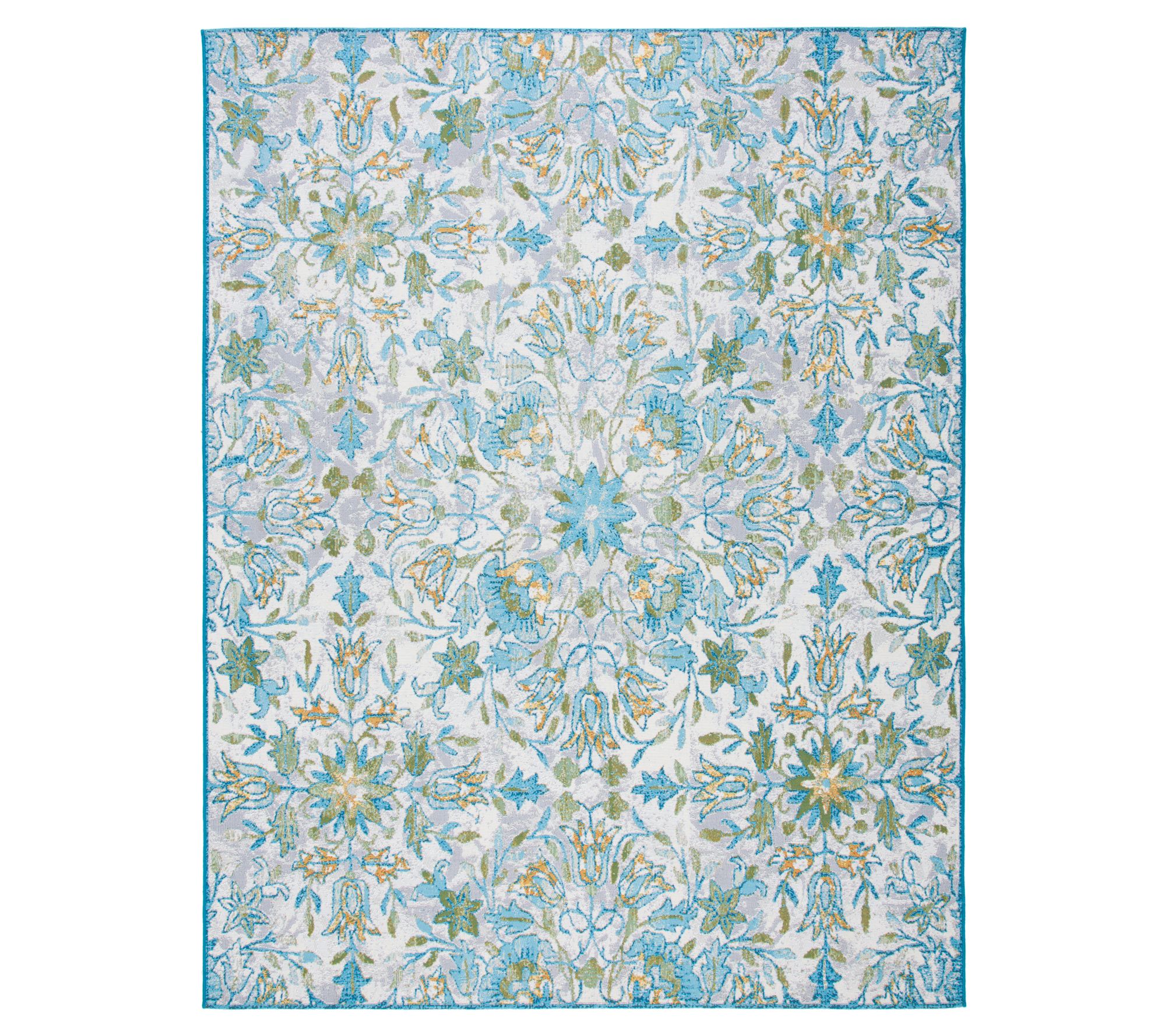 Transport any room or outdoor gathering space to a breezy retreat with the Barbados Tropica rug, featuring lush floral details in gentle hues of ivory, light blue, and soft gold. Its versatile style and easy-care design make it a vibrant addition to patios, decks, and high-traffic indoor areas alike. From Safavieh.
