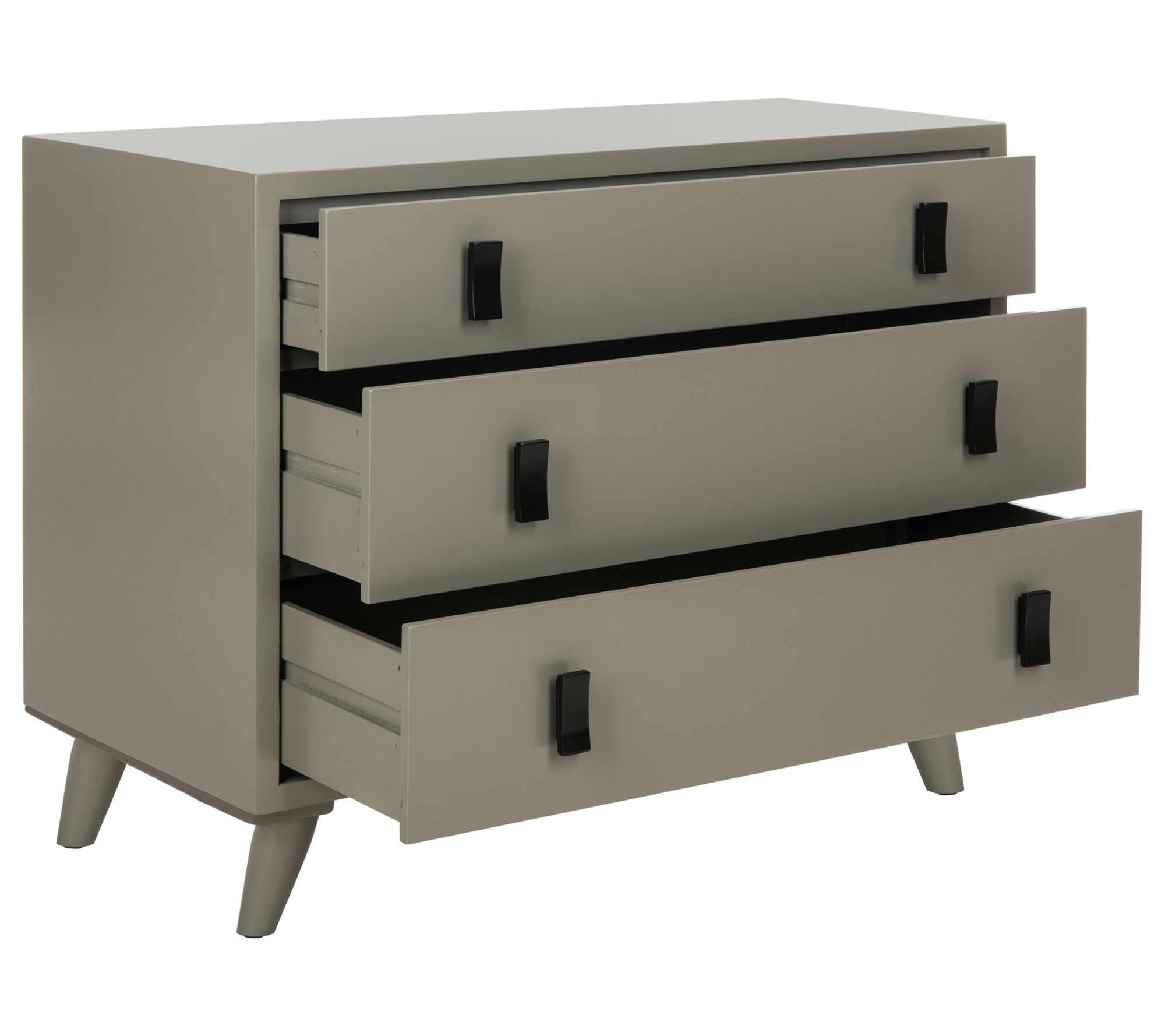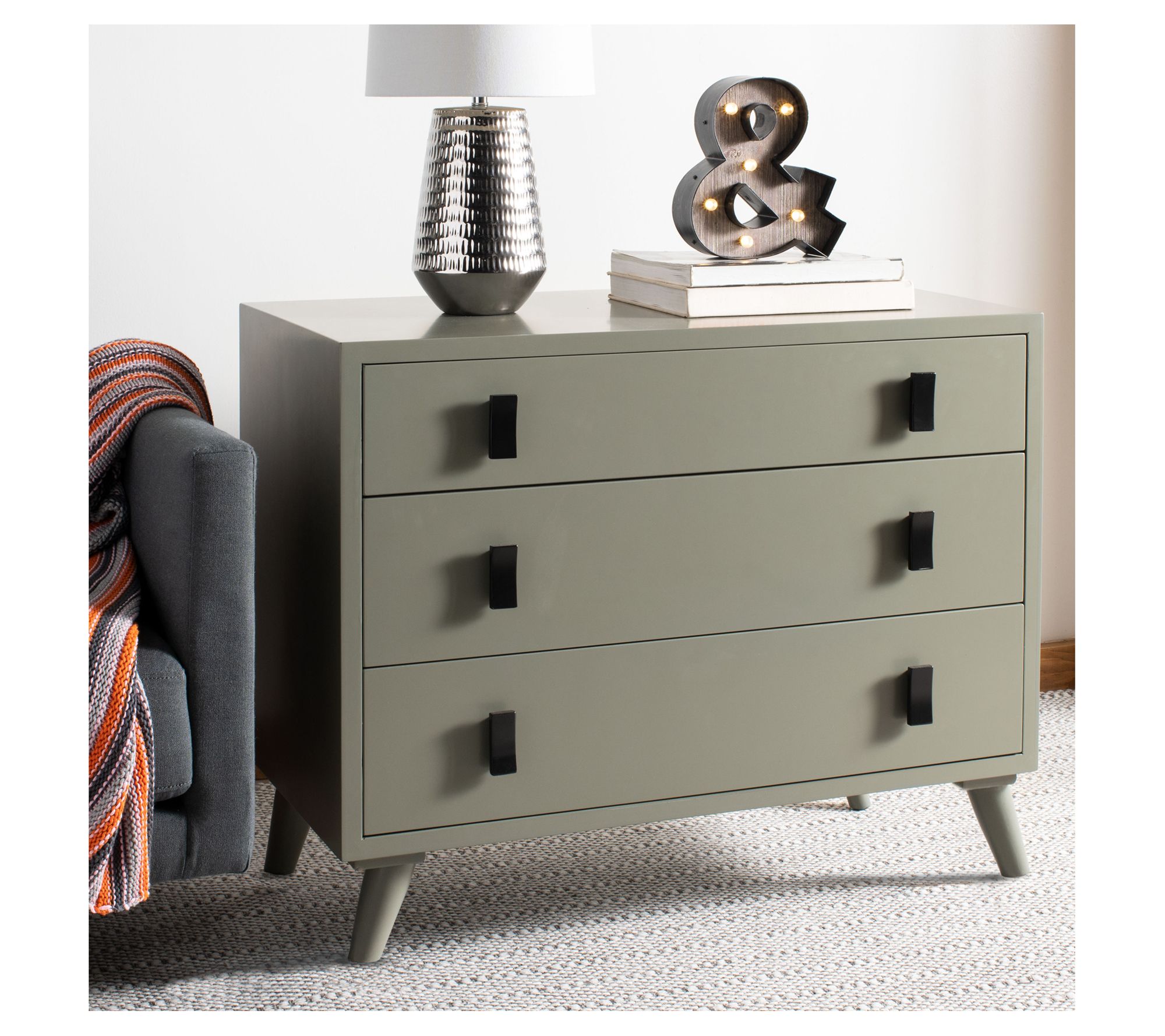 Transform any room with this three-drawer chest, a piece that combines retro charm with contemporary flair. Its neutral dark grey finish and black wooden pulls make it a versatile addition to your living space, whether used as a stylish nightstand or as a functional chest in the living room. From Safavieh.
