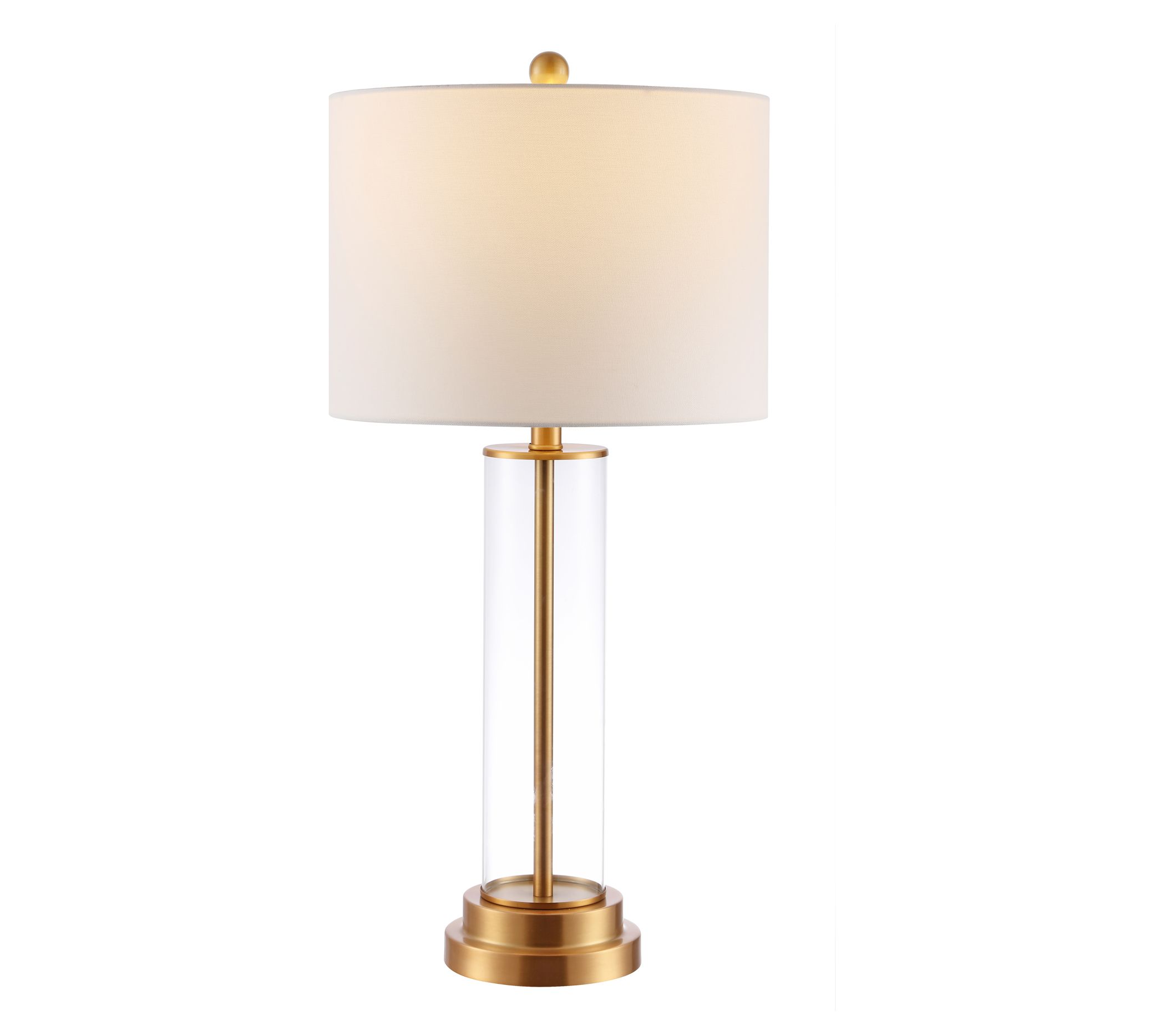 Cassian's glass cylindrical body encompasses a sleek metal interior and sits atop a layered pedestal base, bringing decorative depth and dimension to any room. From Safavieh.