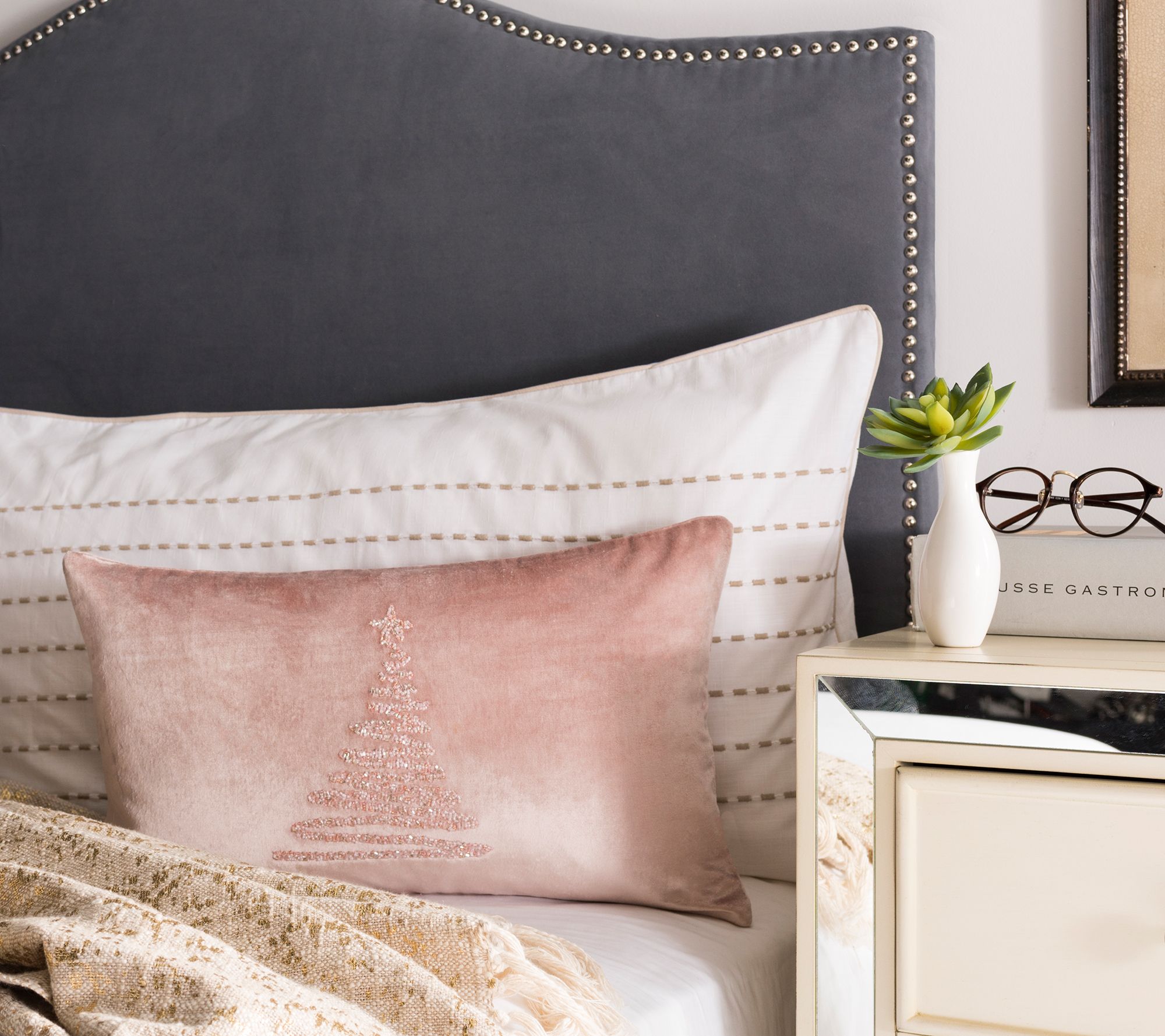 Sofa, bench, accent chair, or loveseat, this contemporary tinseled evergreen pillow adds a hint of holiday excitement to any room. From Safavieh.