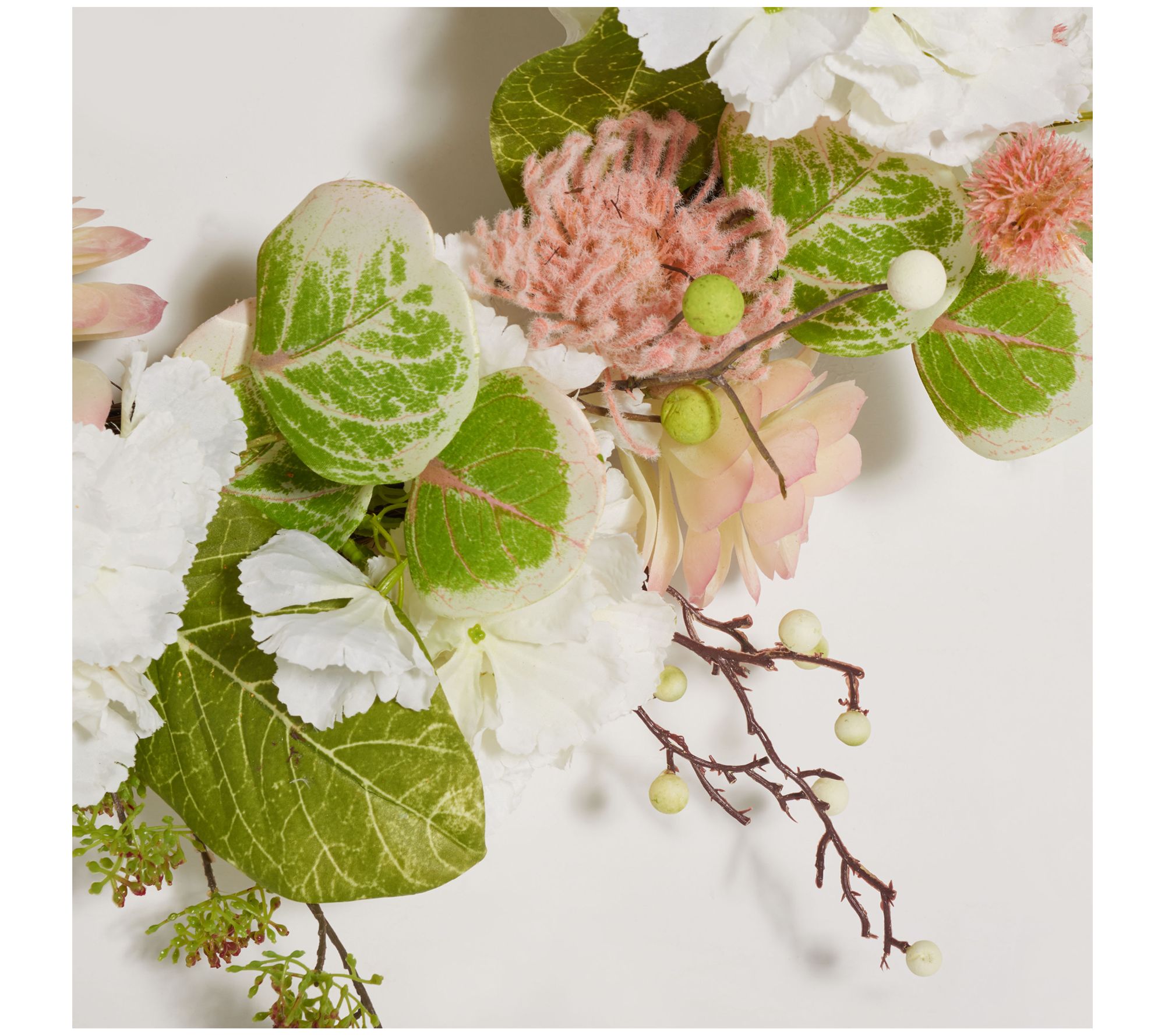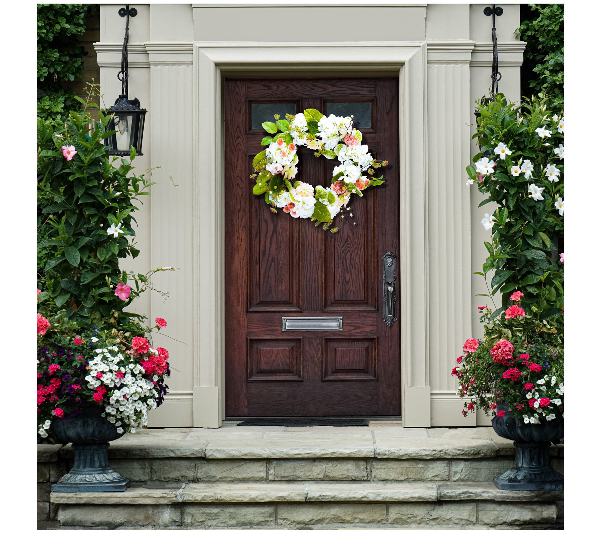 Spring into the season and greet your guests with the lifelike natural beauty of this hydrangea and magnolia wreath hanging from your door, above your mantel, or nestled on your dining table as part of a lovely centerpiece. From Safavieh.