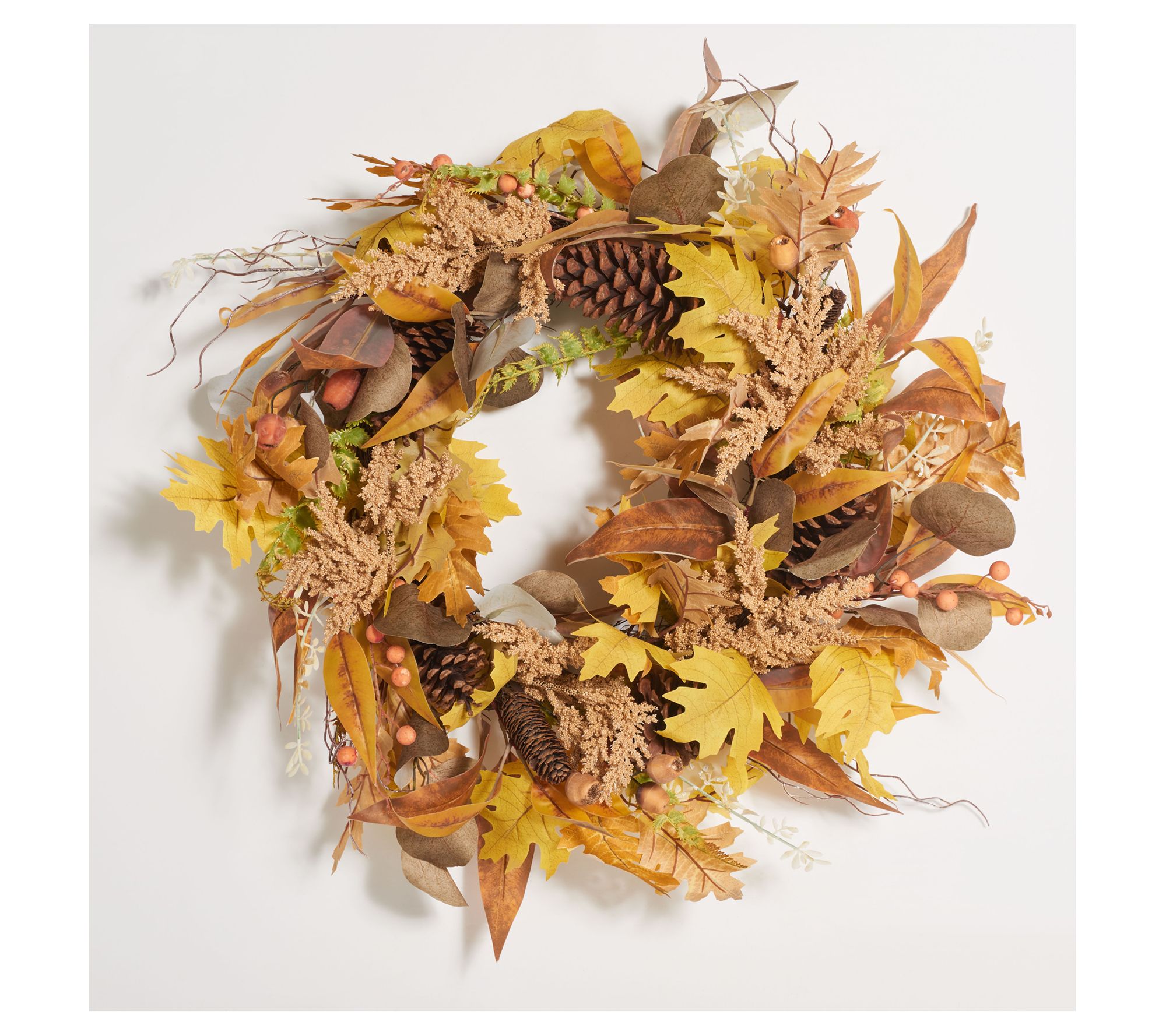 Give a warm and hearty autumnal touch to your home with this faux oak and eucalyptus wreath. From Safavieh.