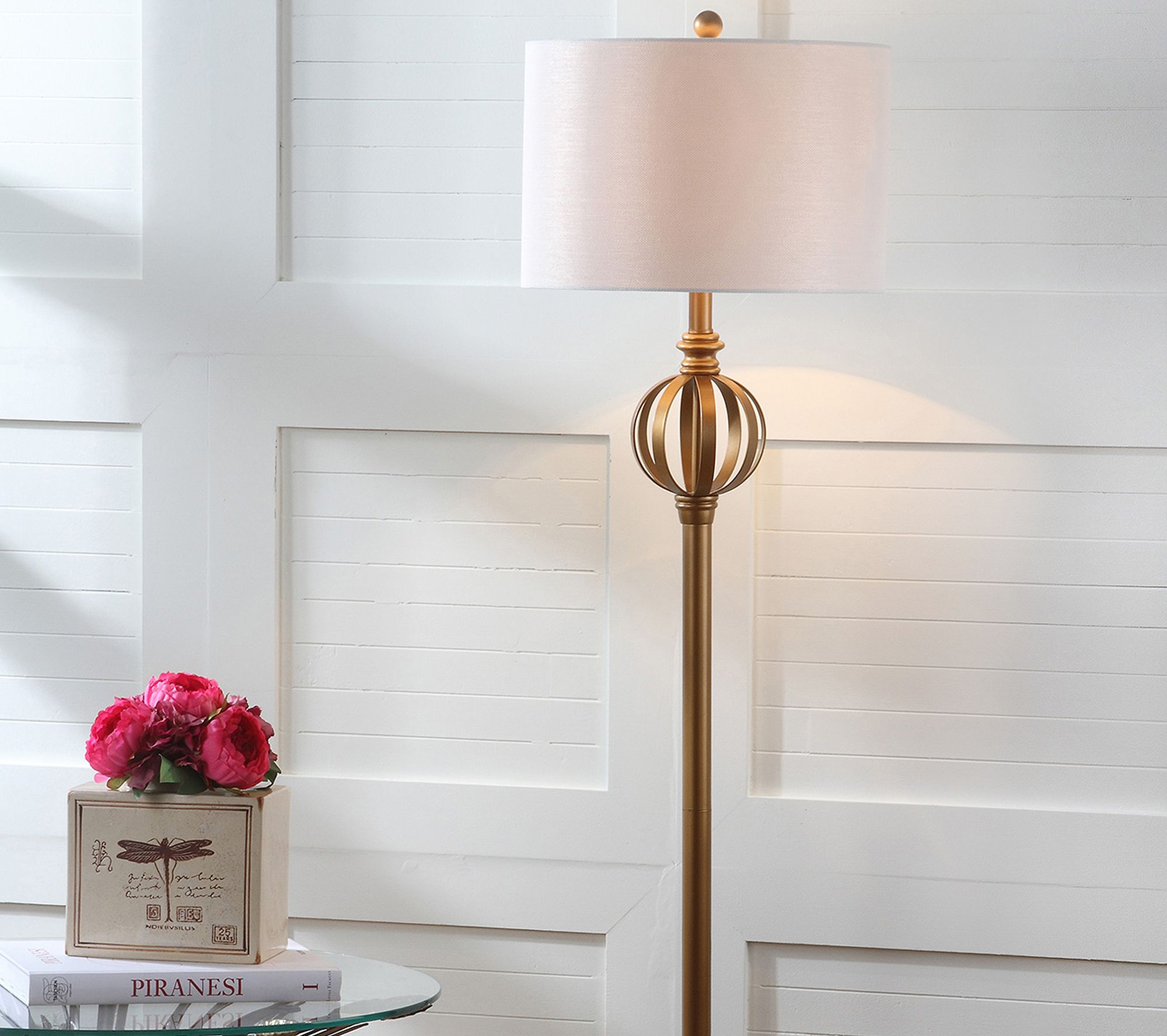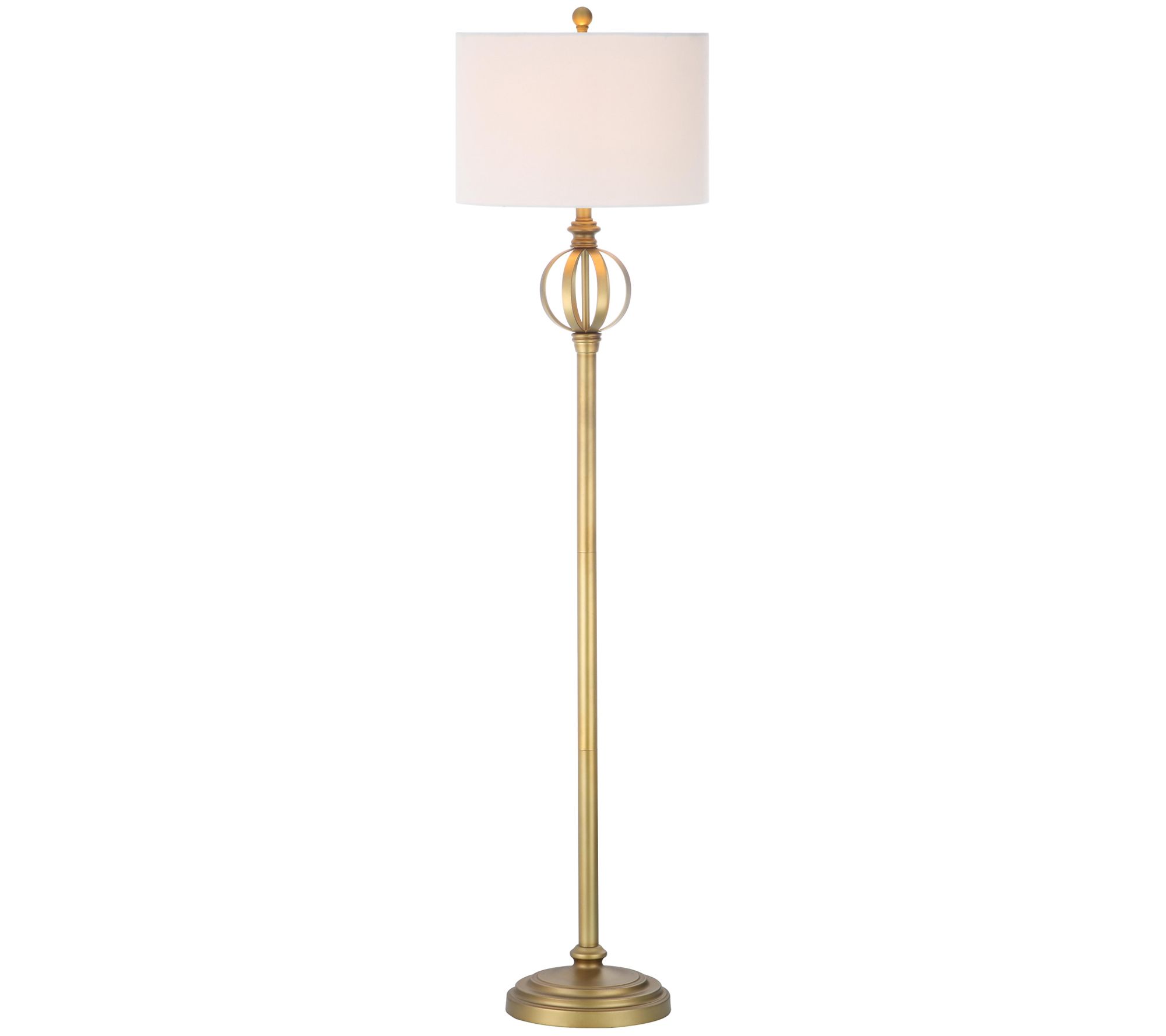 Safavieh's Garden Sphere floor lamp pairs a beautiful bronze-finish base with a white cotton drum-shaped shade. From Safavieh.