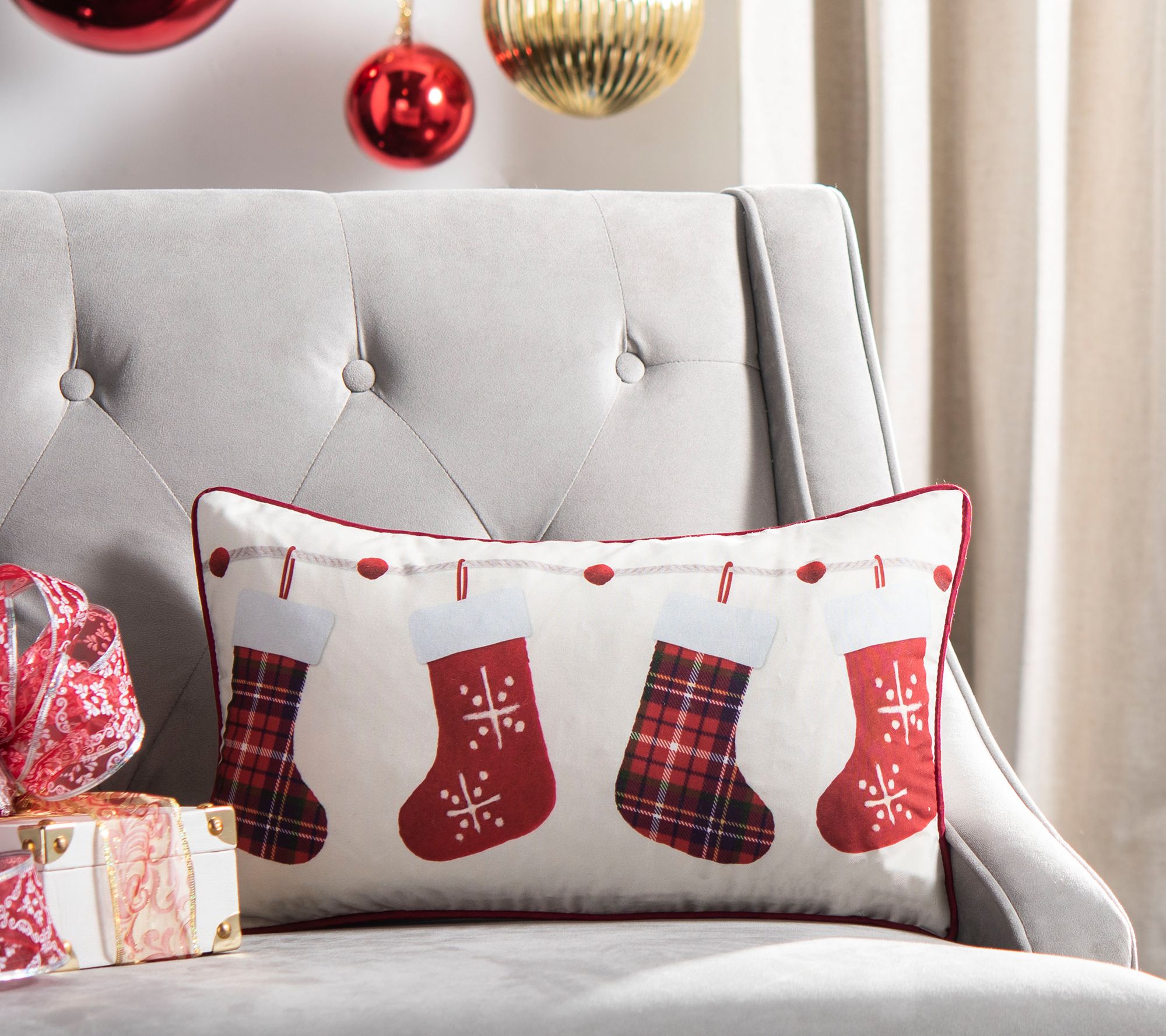 Sofa, bench, accent chair, or loveseat, this colorfully adorned pillow covered in stockings adds a hint of holiday excitement to any room. From Safavieh.