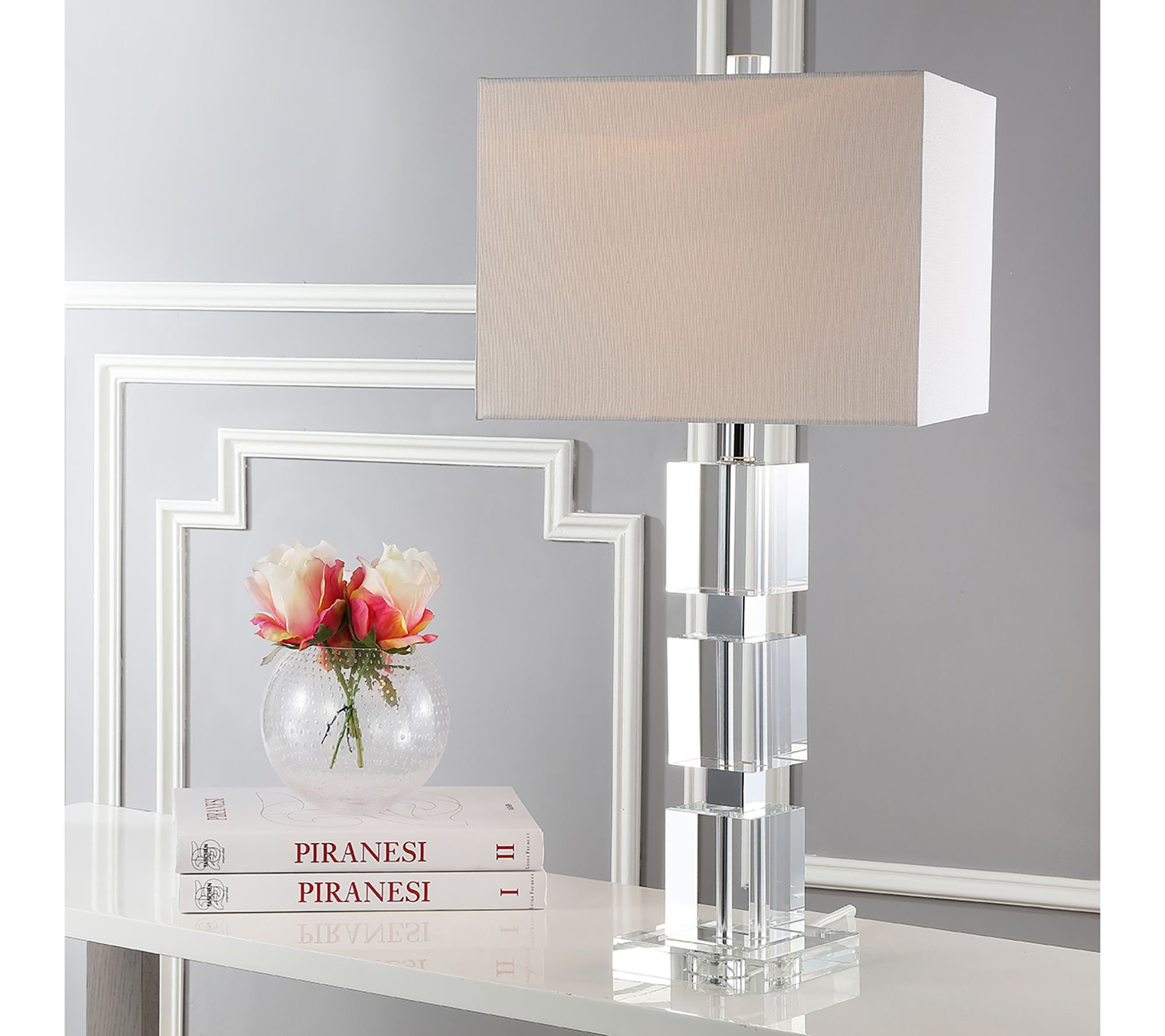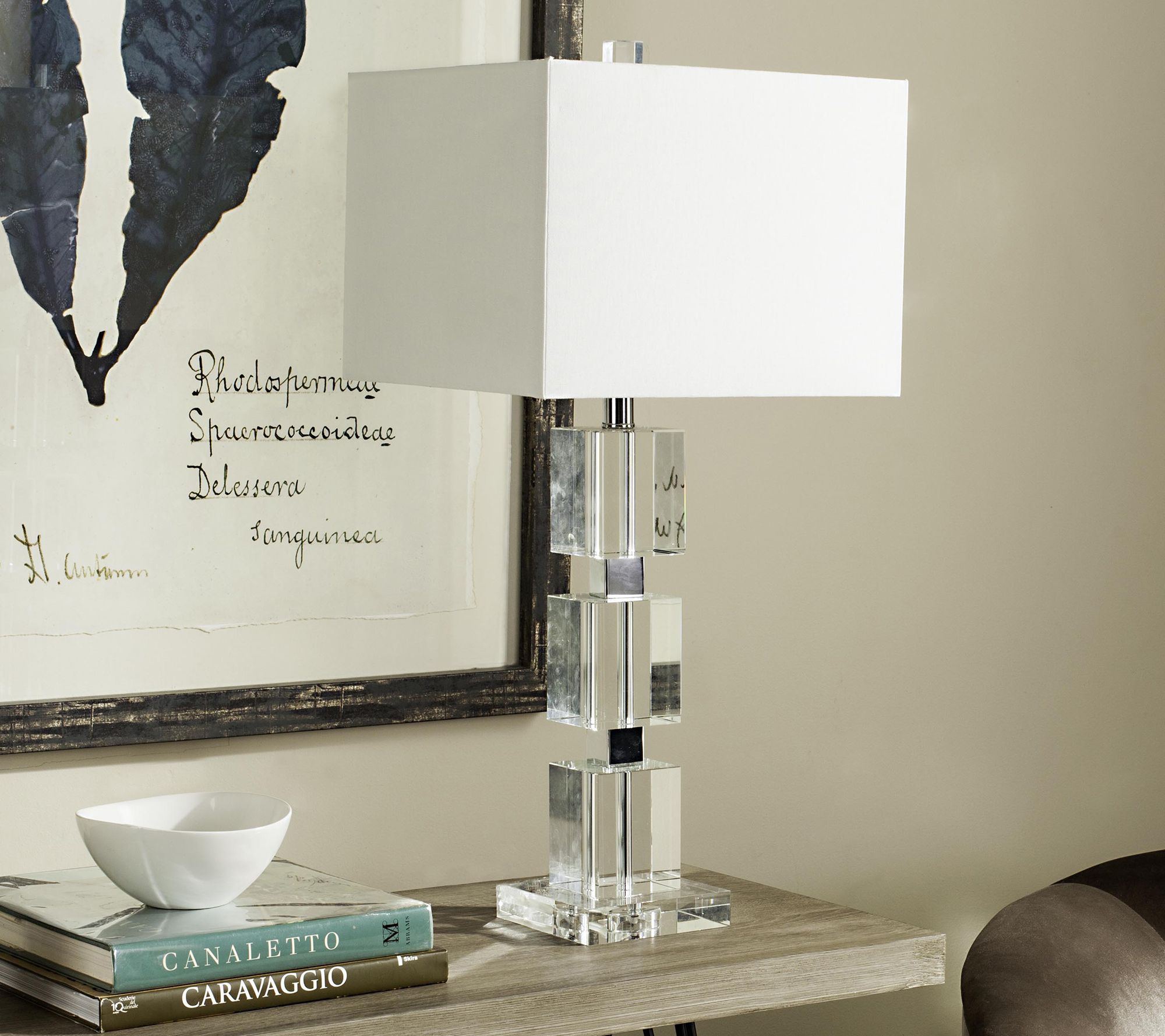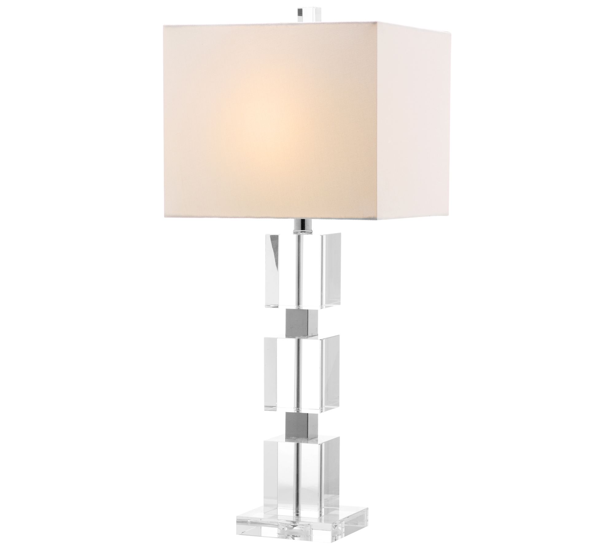 Crystal and chrome form the base of this clean and modern cube lamp, with a rectangular linen shade topping its chic geometric form. From Safavieh.