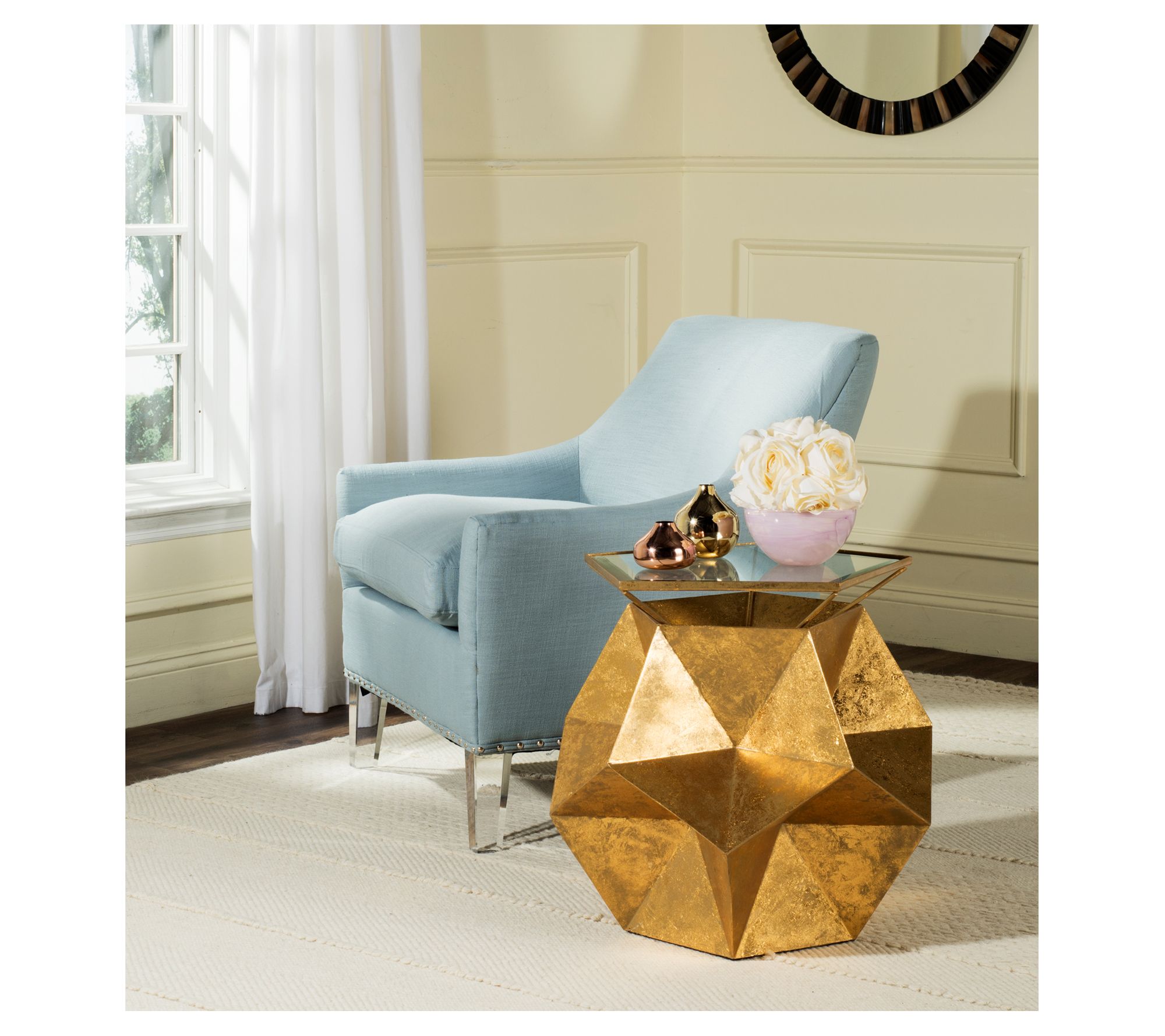 The intricate geometry of finely cut gems inspired this glamorous Iona side table. It boasts a conceptually complex, sculptural silhouette in a golden finish, giving any room a rich sense of decorative depth. From Safavieh.