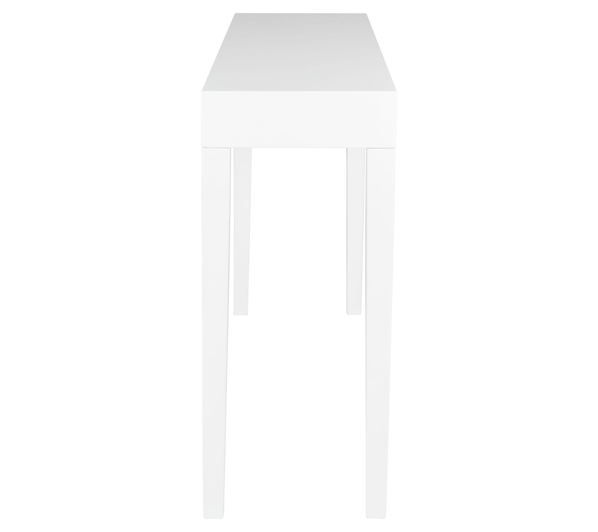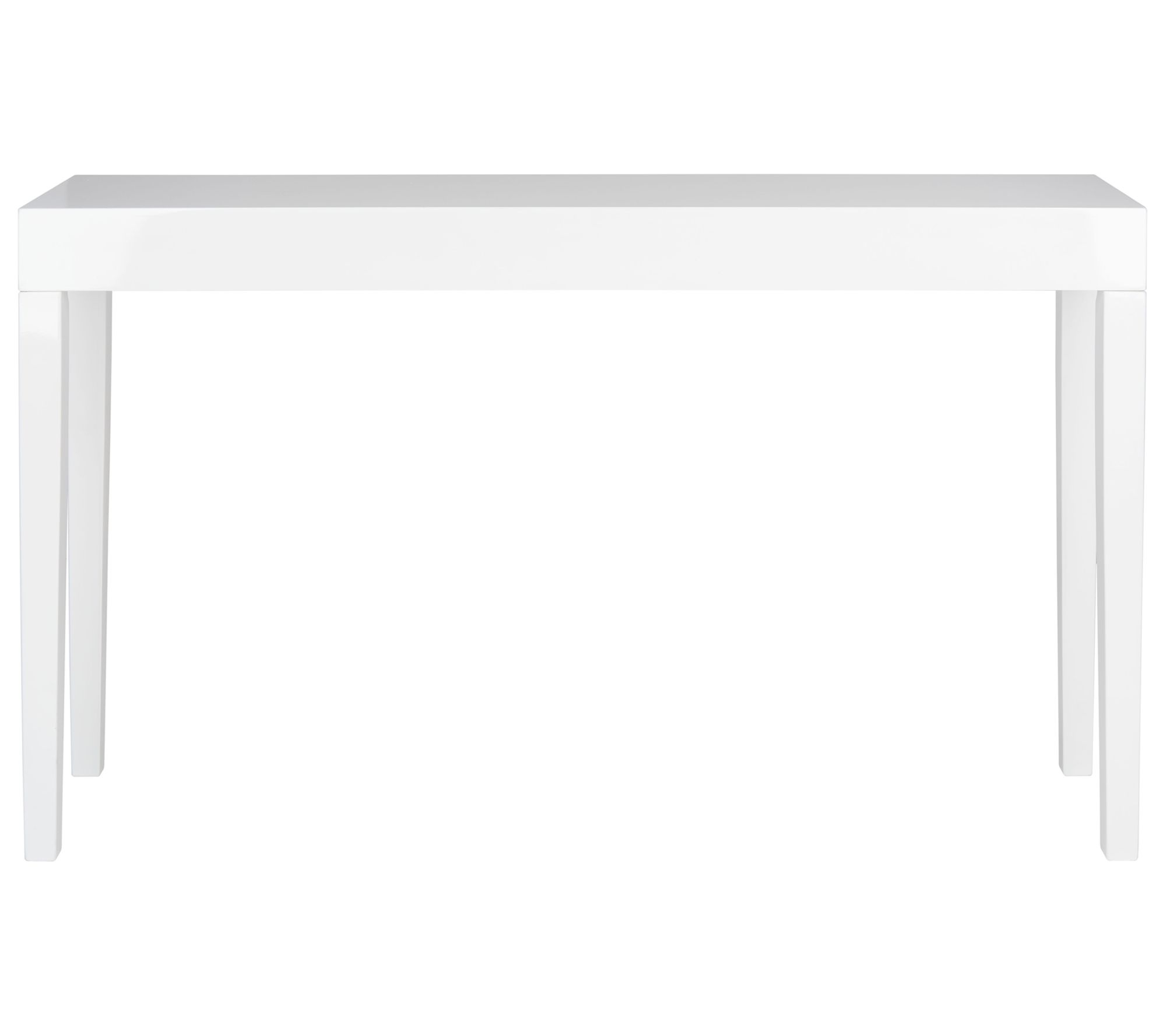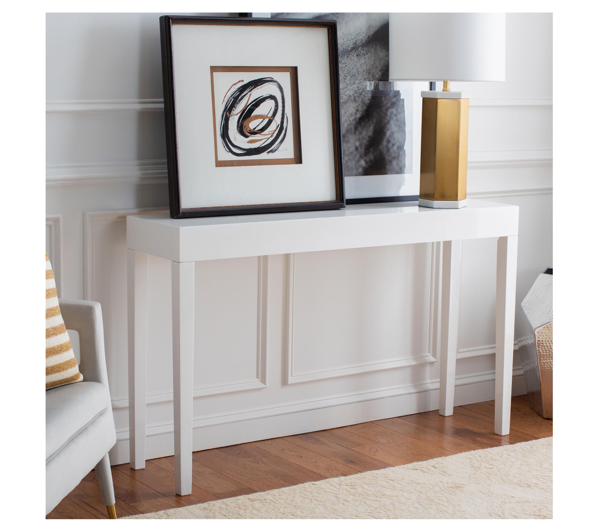 Transform your entryway or living space with the sleek elegance of the Safavieh Kayson Console Table. This piece brings a touch of mid-century Scandinavian flair, featuring slightly tapered legs and a crisp white lacquer finish, making it an ideal statement piece for an entry hall or a focal point in your living room. From Safavieh.