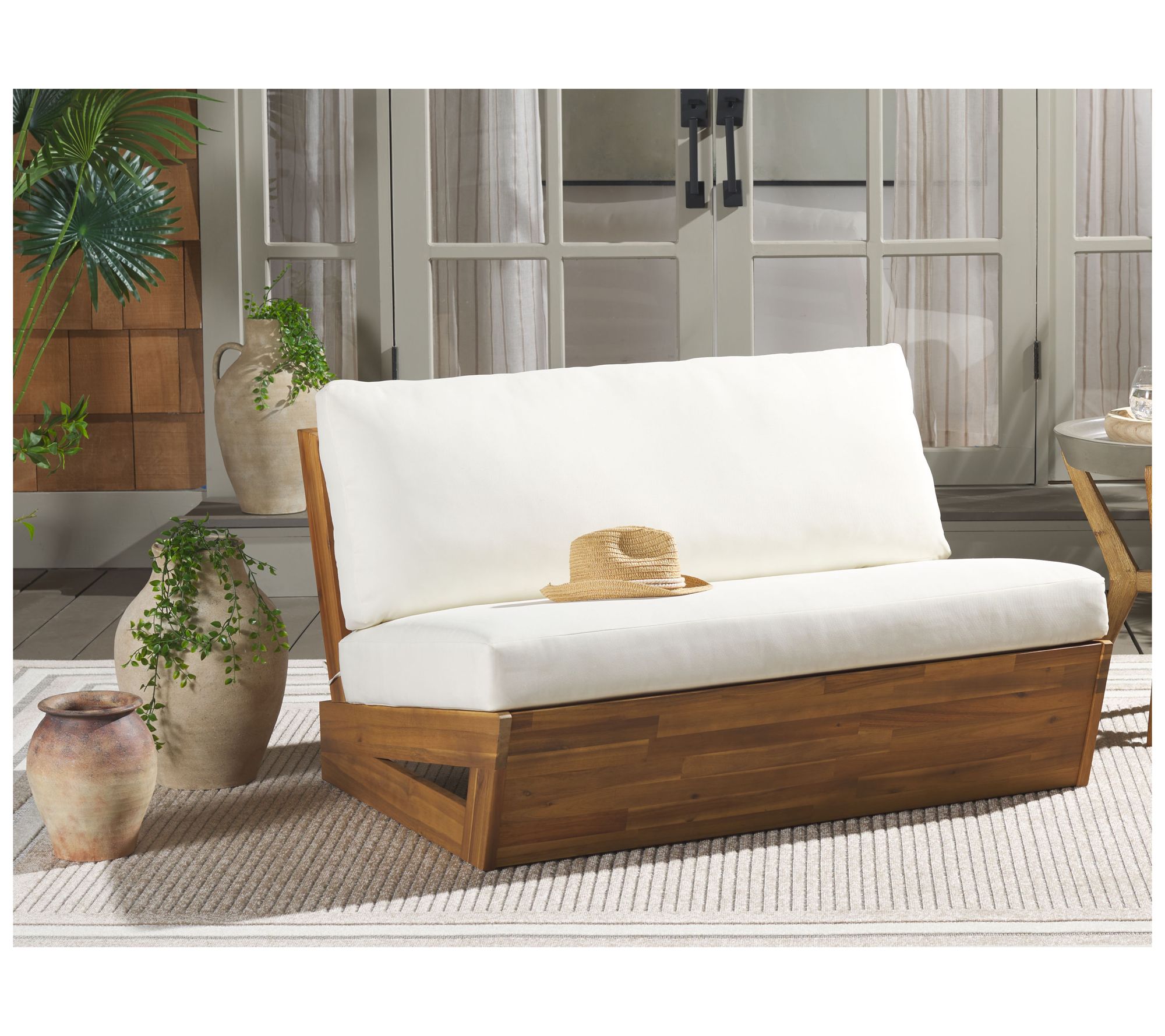 Elevate your outdoor lounging experience with the Safavieh Dune sofa. This thoughtfully crafted piece is perfect for unwinding in your backyard, combining sturdy acacia wood with foam and fabric cushions for both durability and comfort. Its natural wood tones and cozy cushions create a relaxing oasis that seamlessly blends with the open air. From Safavieh.