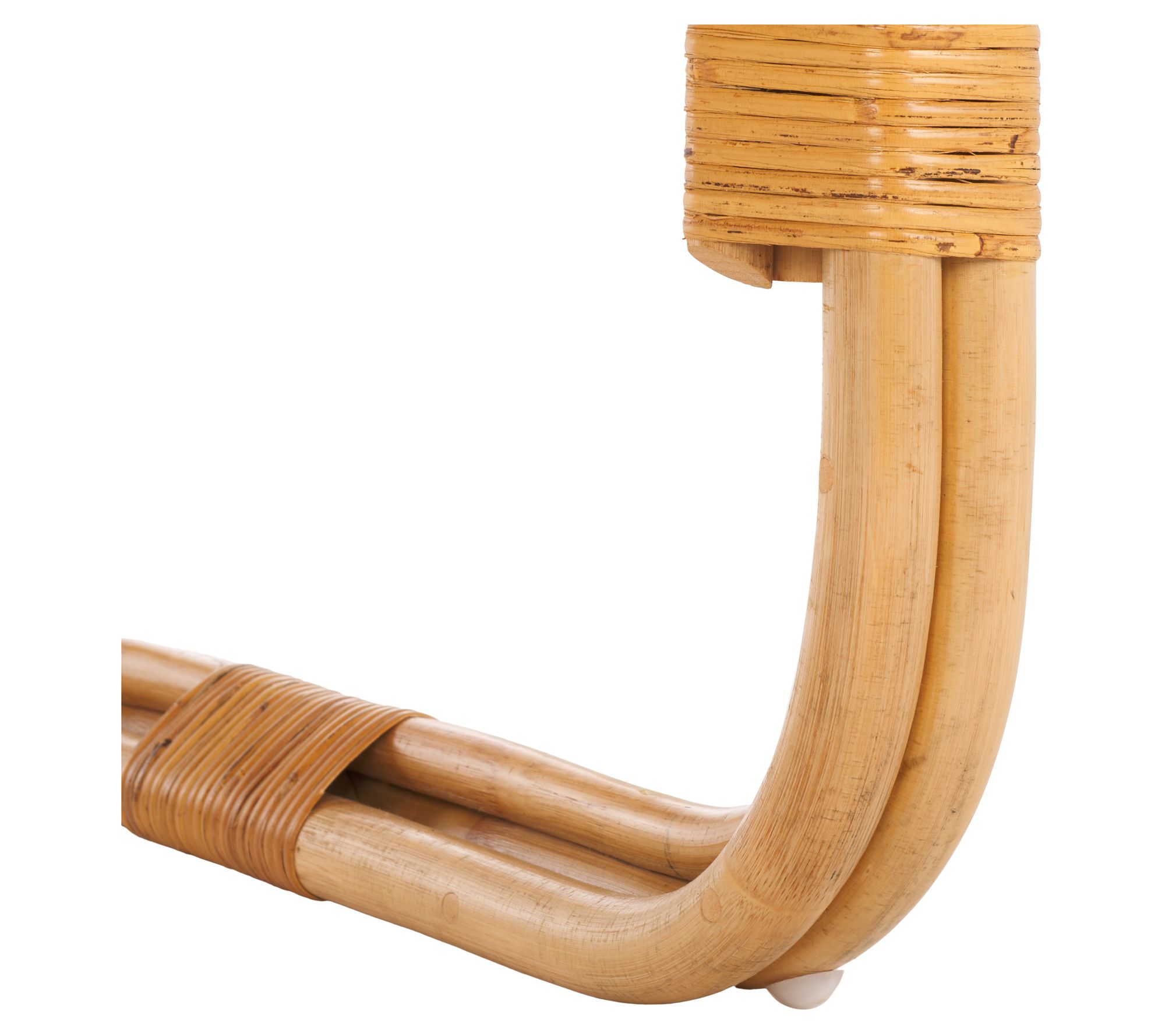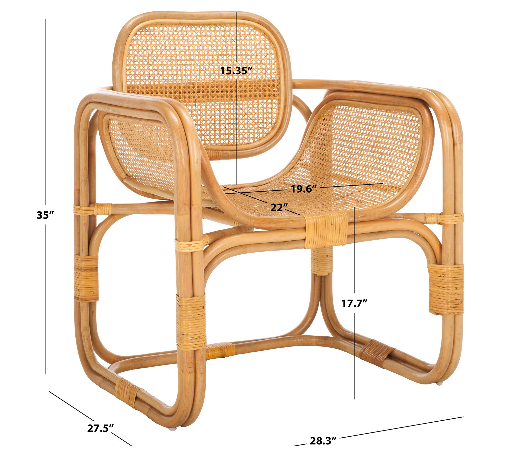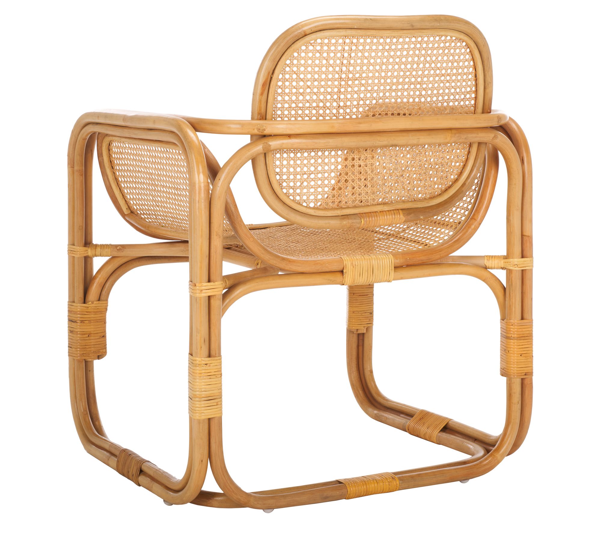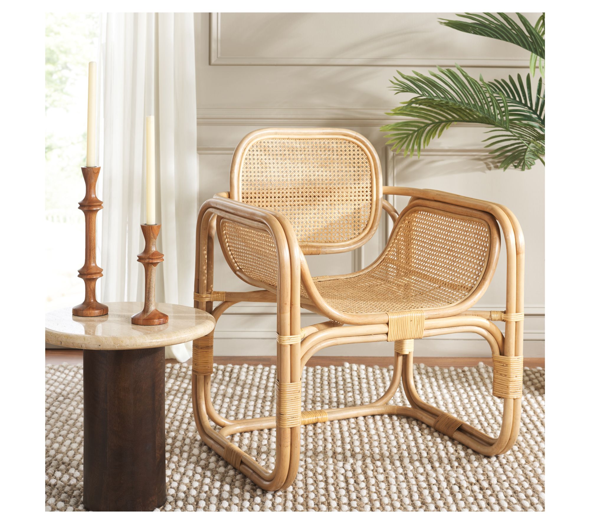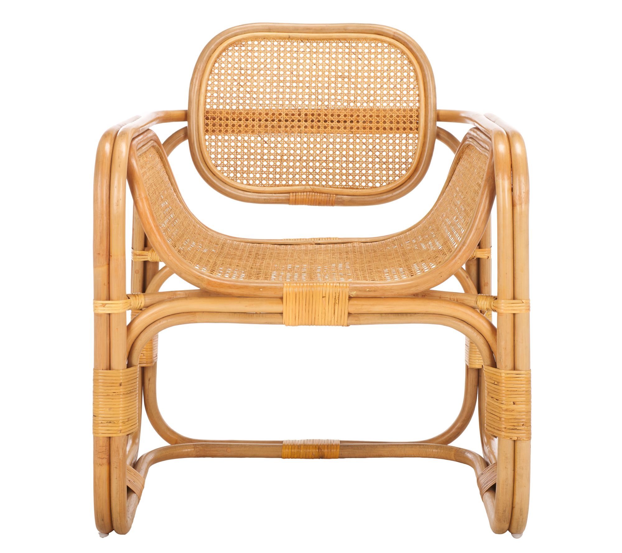 Make a breezy and chic statement with the Safavieh Nadie Rattan Accent Chair. Combining crisp lines with graceful curves, its stately and dramatic design features a round back and contoured seat adorned with rattan mesh for an airy and elegant appeal. Expertly crafted with rattan poles and finished with a sleek clear lacquer, this versatile chair effortlessly transitions from a refined lounge to a cozy bedroom or reading nook. From Safavieh.