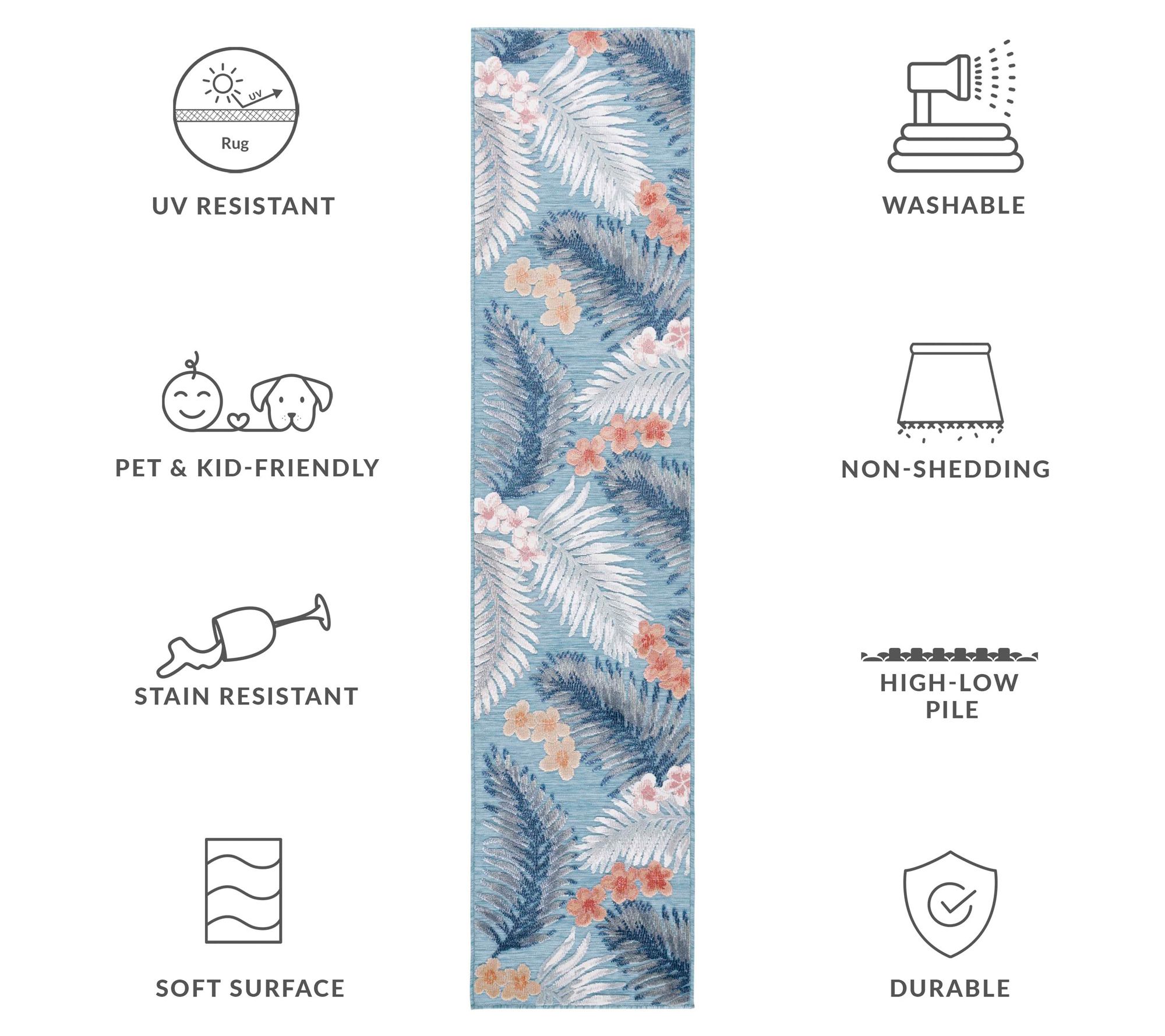 Vivid colors and bold patterns invite year-round cheer wherever you place this rug -- whether it's brightening a patio gathering or adding personality to a busy kitchen. Designed to handle daily footsteps and the elements, this outdoor rug is easy to care for -- just hose it off and enjoy effortless style. From Safavieh.
