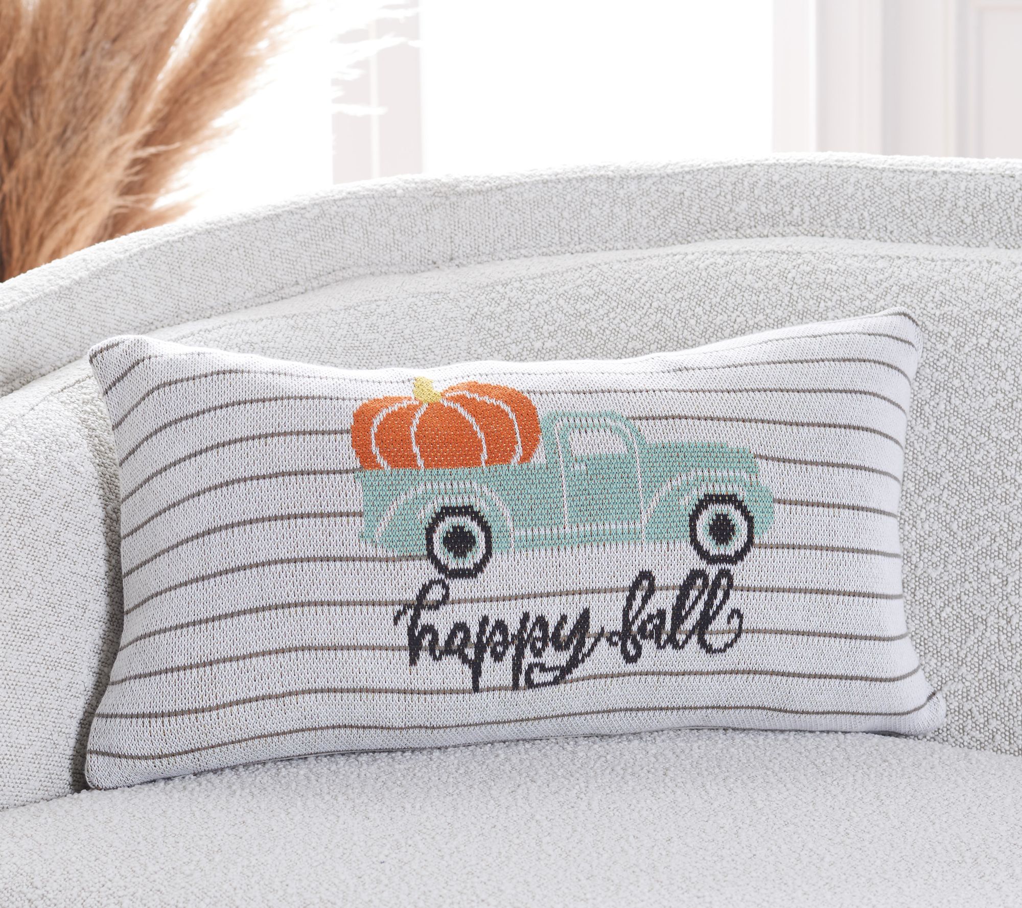 Ultra-soft with playful pinstripes, curling script, and fun graphics, this adorable pillow is ready to deliver a truckload of autumn charm to your sofa or a favorite chair. From Safavieh.